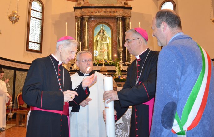 Quindi un ulteriore gesto della tradizione: l’omaggio del cero da parte dell’Amministrazione comunale. Il sindaco Pietro Fiori l’ha offerto al vescovo Antonio Napolioni. Ma è stato l’emerito Dante Lafranconi ad accenderlo prima che il primo cittadino lo ponesse accanto all’immagine della Madonna.