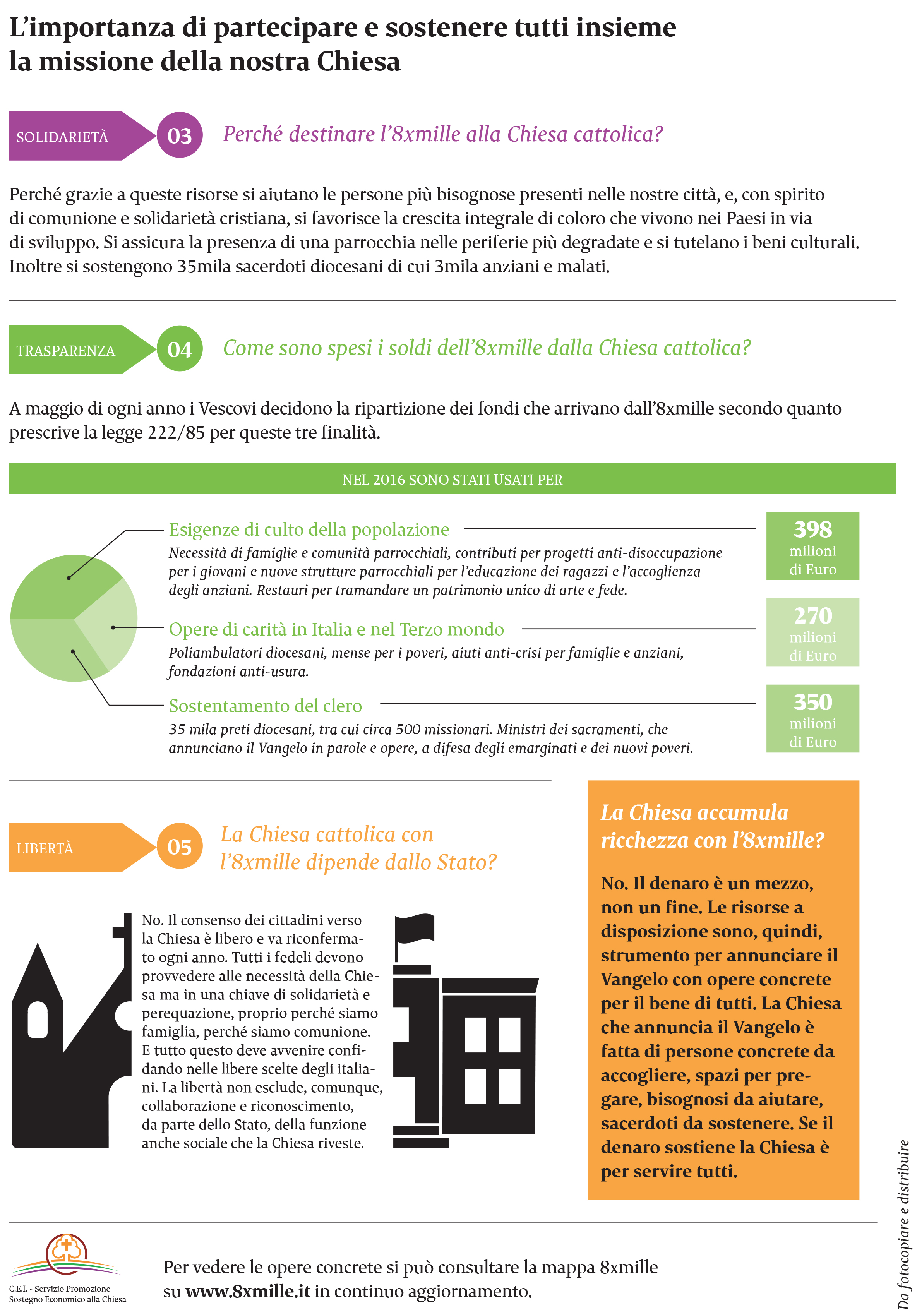 «La possibilità di destinare l’8xmille del gettito Irpef alla Chiesa cattolica nasce dalla revisione concordataria del 1984 ed è in vigore dal 1990. I fondi raccolti hanno tre destinazioni (legge 222/85): esigenze di culto e di pastorale della popolazione, sostentamento del clero diocesano e interventi caritativi in Italia e nel Terzo Mondo. Grazie all’80% dei contribuenti che ha scelto di firmare per la Chiesa cattolica, nel 2016 è stato possibile contribuire così alla missione della Chiesa: per il culto e la pastorale nelle diocesi e nelle parrocchie (156 milioni di euro), per interventi religiosi a livello nazionale tra cui anche tribunali ecclesiastici e fondo catechesi ed educazione cristiana (102,8 milioni di euro), per le nuove chiese parrocchiali, per le iniziative nazionali e il restauro del patrimonio artistico (140 milioni), per i progetti di carità in Italia e nel Terzo Mondo (270 milioni), per sostenere 35 mila sacerdoti diocesani, compresi 600 fidei donum in missione nei Paesi in via di sviluppo (350 milioni di euro).