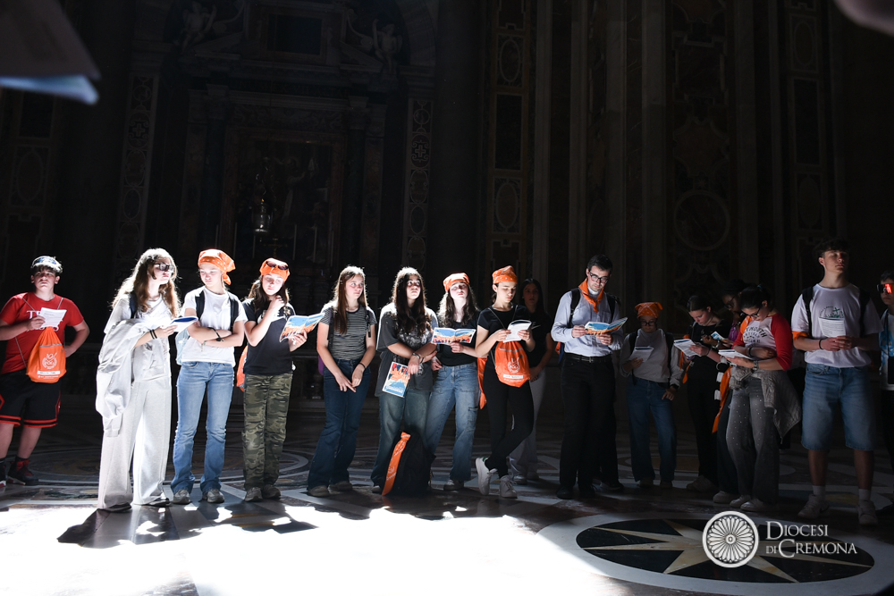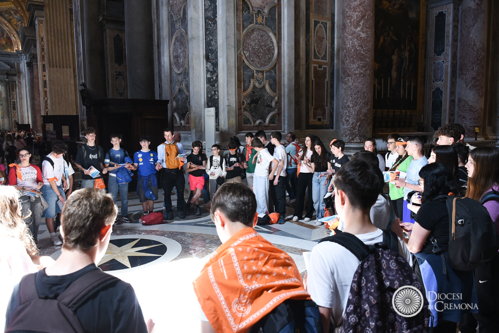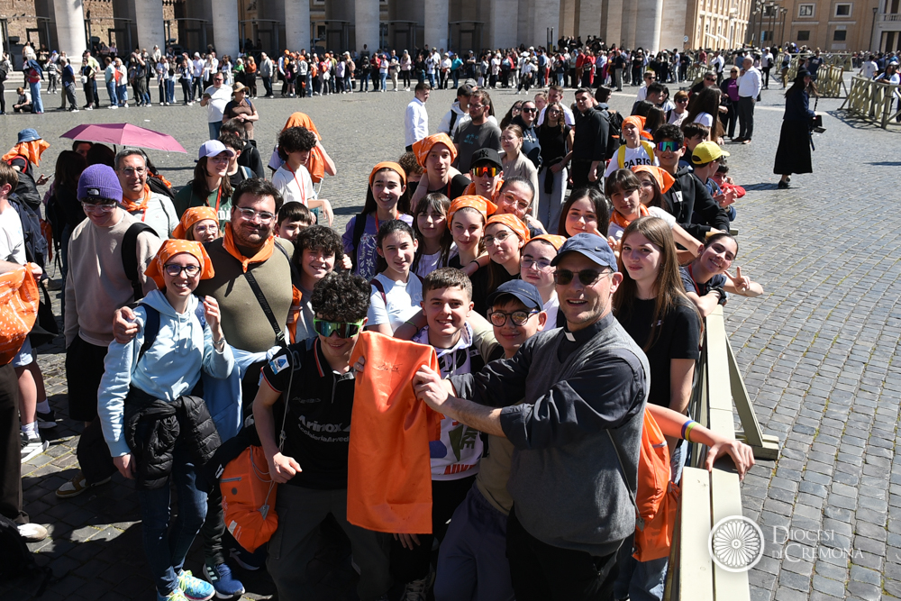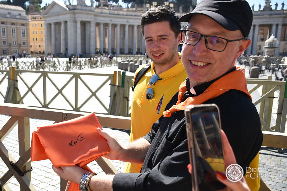 Poco distante, sul sagrato (nella zona del “sagrato alto” riservata ai saluti istituzionali), il gruppo dei collaboratori della FOCR, insieme a don Francesco Fontana e ai diaconi del Seminario, hanno potuto scambiare qualche parola con il Santo Padre. È stato un momento di straordinaria semplicità e vicinanza. A Papa Leone, che ha chiesto incuriosito il numero dei ragazzi, hanno avuto modo di spiegare il significato di quelle felpe gialle: il colore del servizio e del coordinamento di una macchina organizzativa che ha portato a Roma un pezzo importante della Chiesa cremonese.