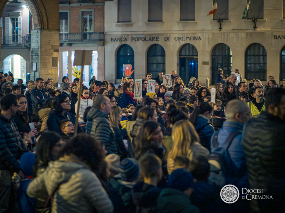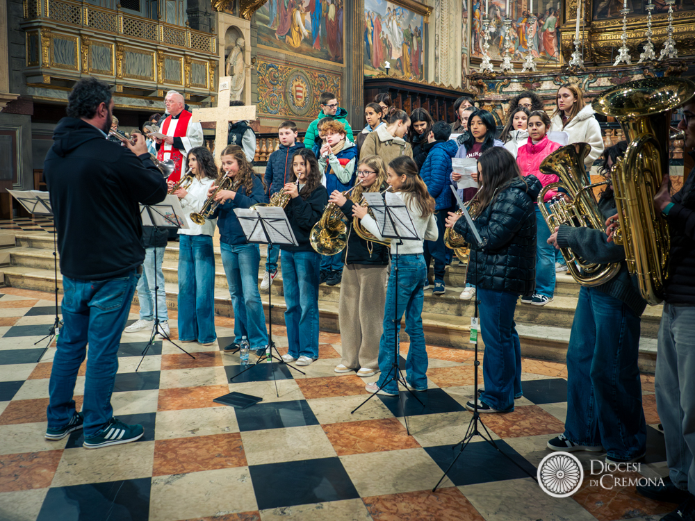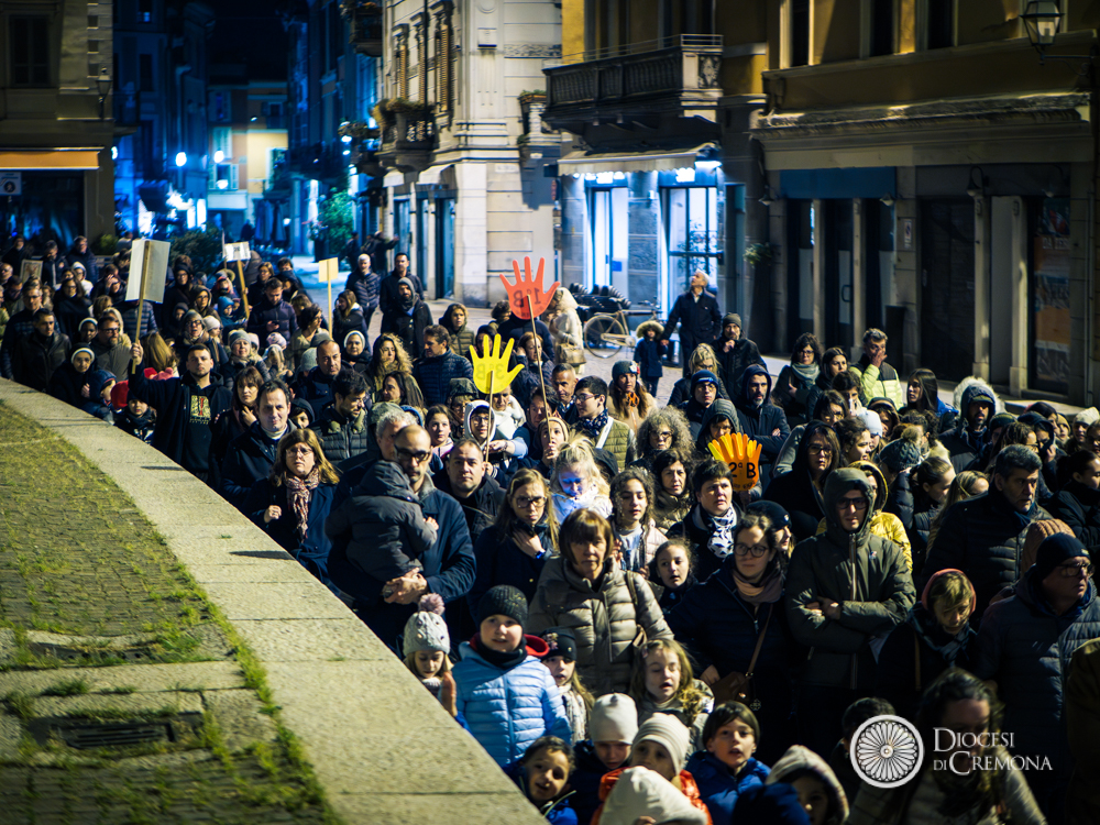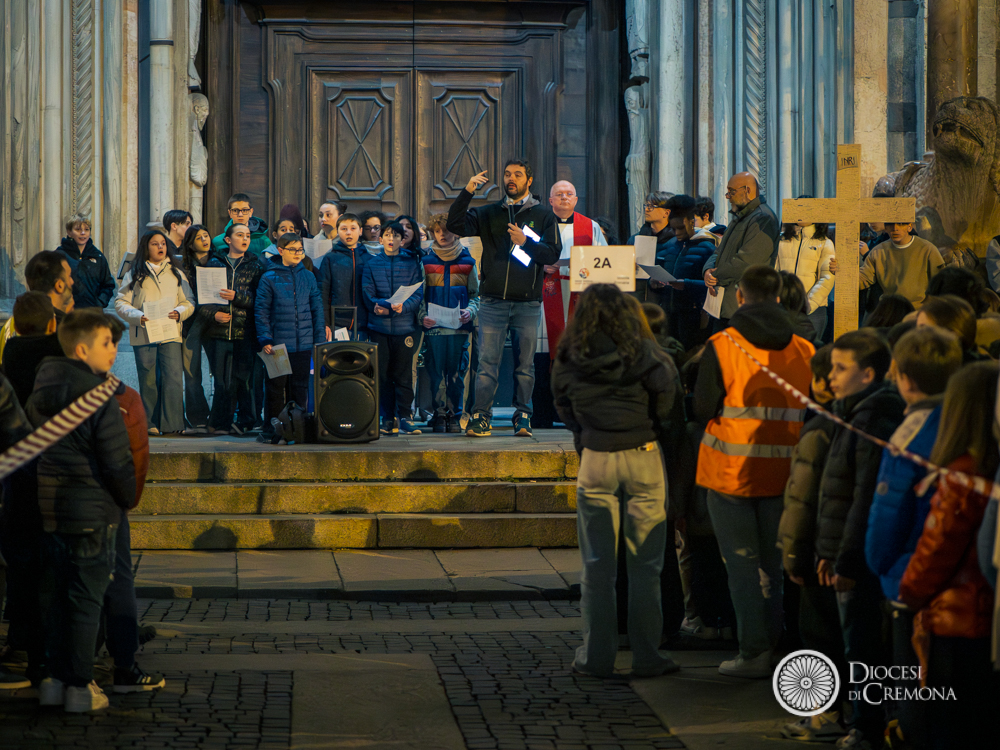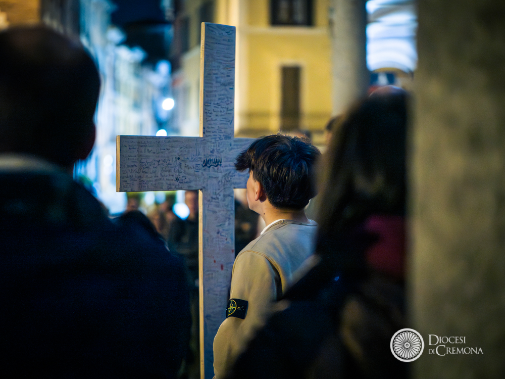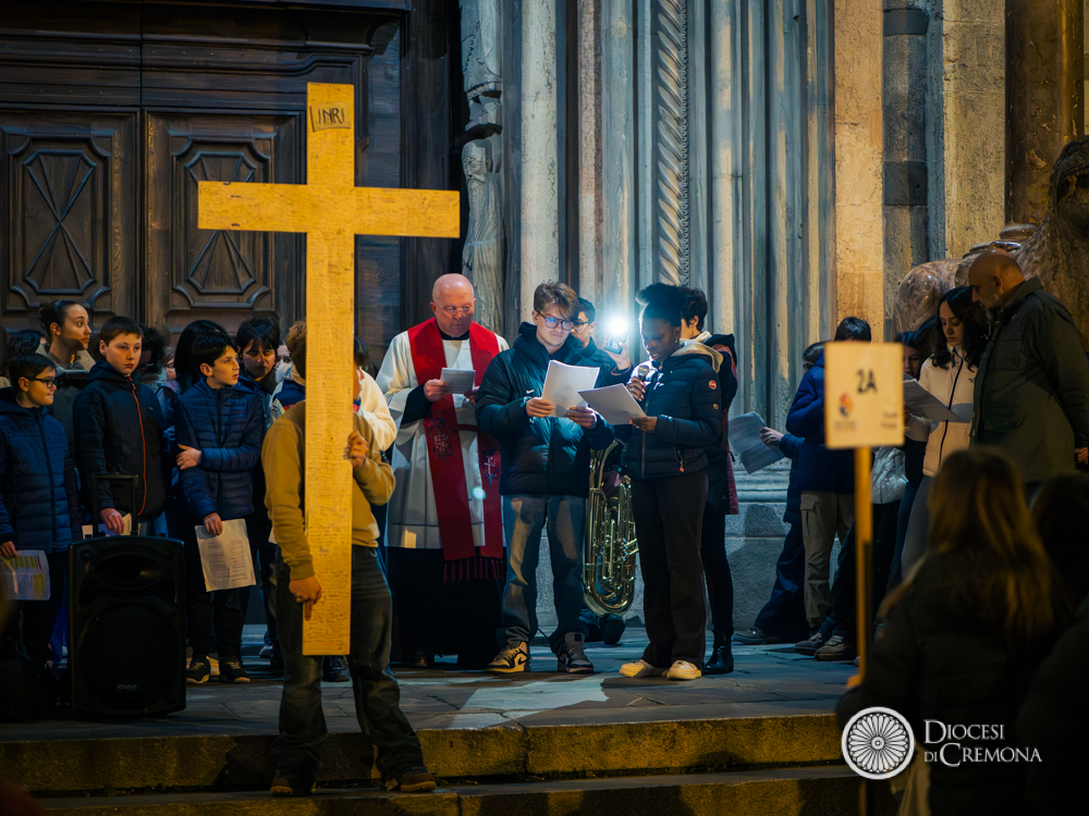 La preghiera, guidata da don Fabio Sozzi, è iniziata davanti al portone della Cattedrale, da cui si è snodata la processione che ha portato in largo Boccaccino, in piazza Sant’Antonio Maria Zaccaria e poi all’interno della Cattedrale, dove – a causa del maltempo – si sono state vissute le successive stazioni e non soltanto la conclusione.