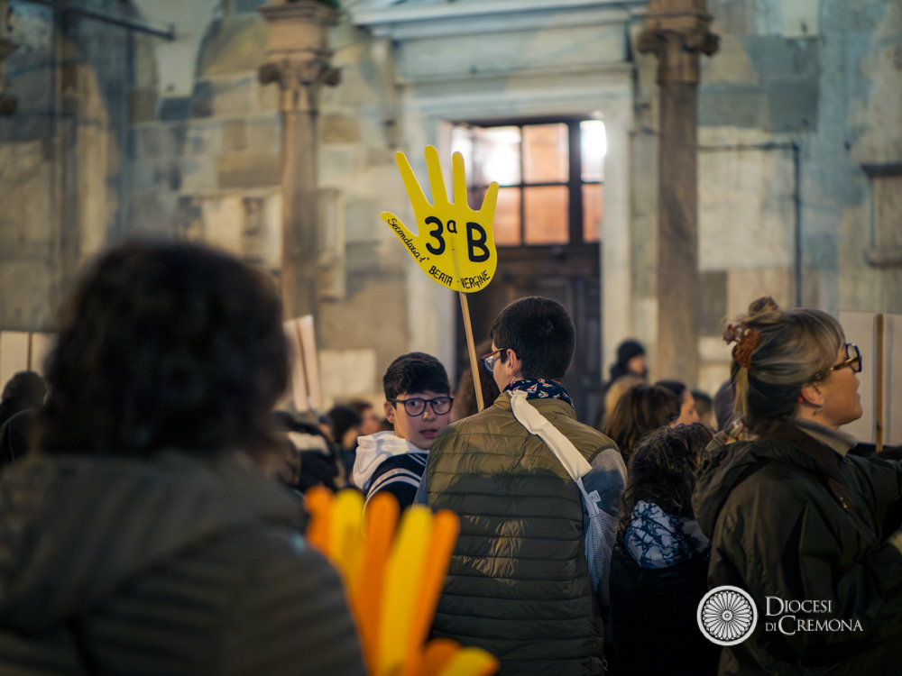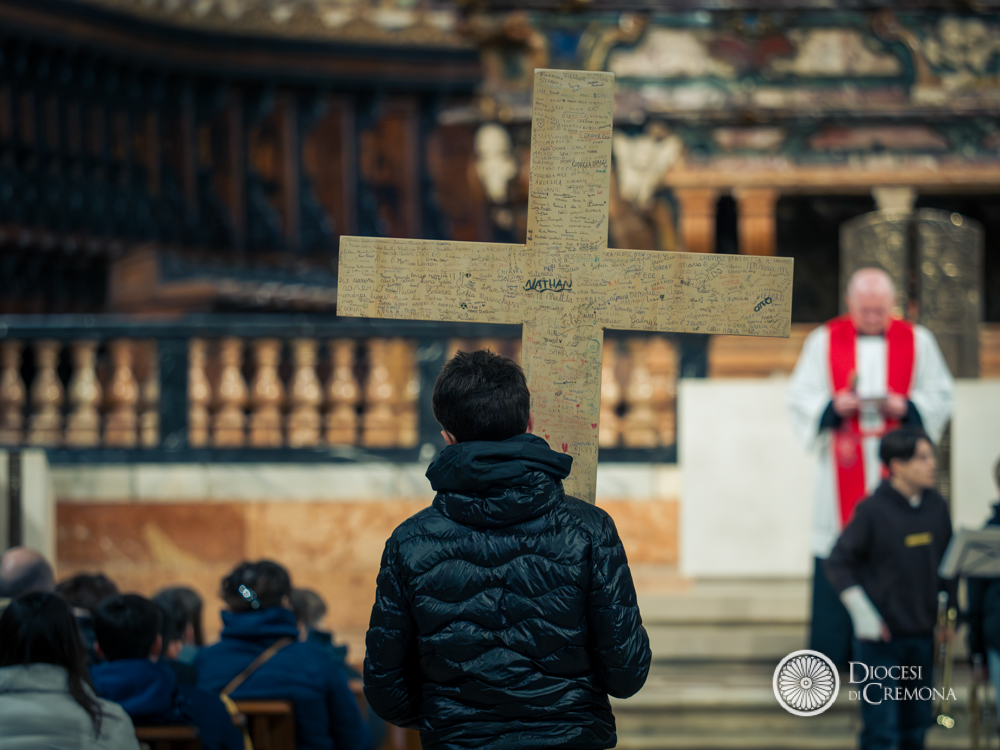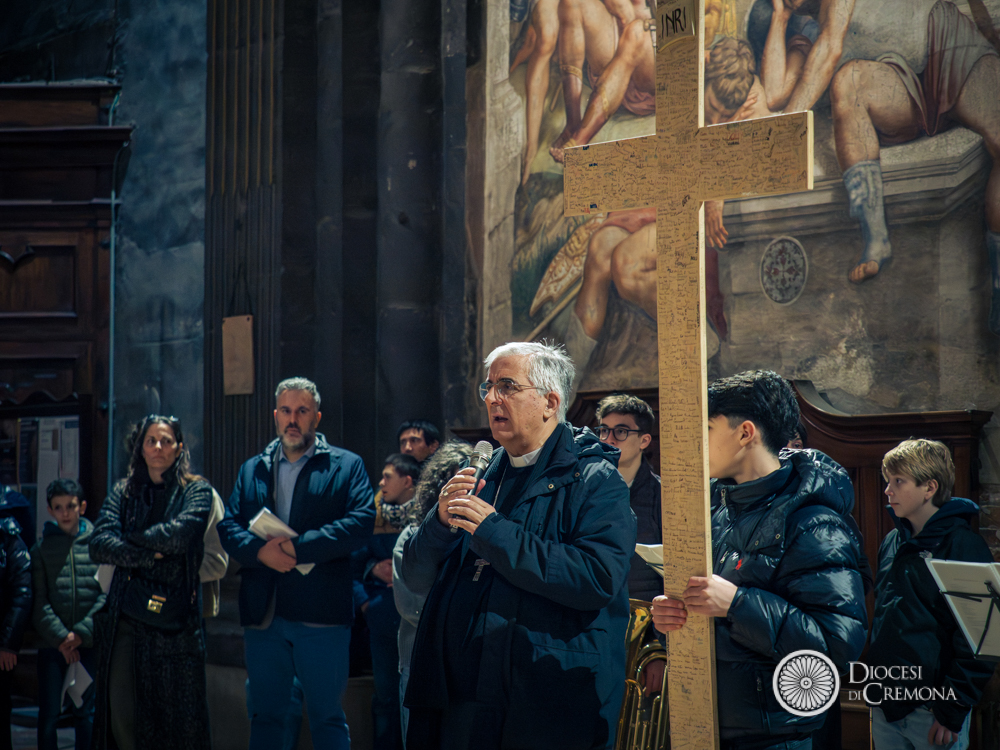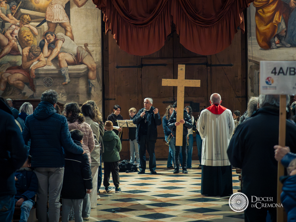 Prendendo posto nei banchi della navata centrale, le diverse scolaresche con le proprie famiglie hanno gremito la Cattedrale, in un clima di raccoglimento che ha avuto il suo culmine quando tutti si sono voltati verso l’enorme dipinto del Pordenone che, in controfacciata, raffigura la scena della crocifissione di Gesù. La lettura a più voci del Vangelo, le intenzioni dei ragazzi e alcuni canti, hanno poi lasciato spazio a una breve riflessione del vescovo Antonio Napolioni.