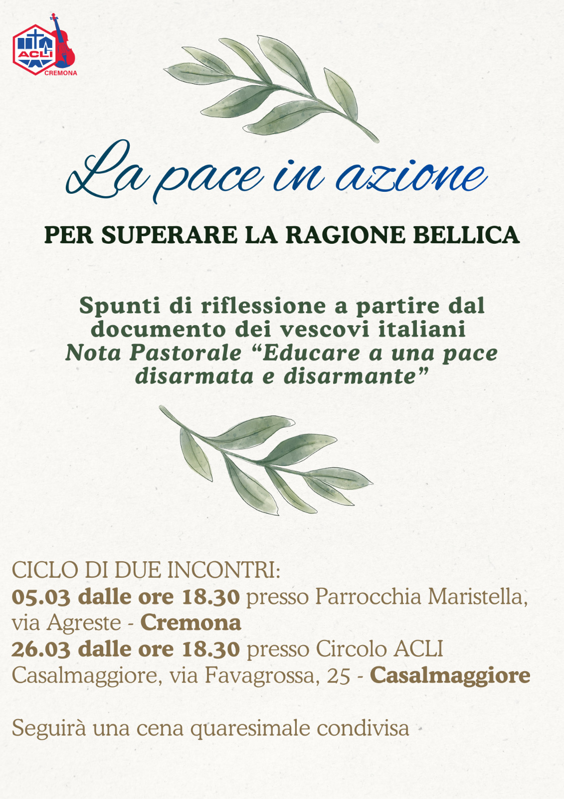 Le Acli cremonesi organizzano per il tempo quaresimale, a partire dal tema associativo di quest’anno “la pace in azione”, due incontri dal titolo “Per superare la ragione bellica”, quale occasione per trovare spunti di riflessione e di azione a partire dalla nota pastorale della Conferenza episcopale italiana “Educare a una pace disarmata e disarmante”.