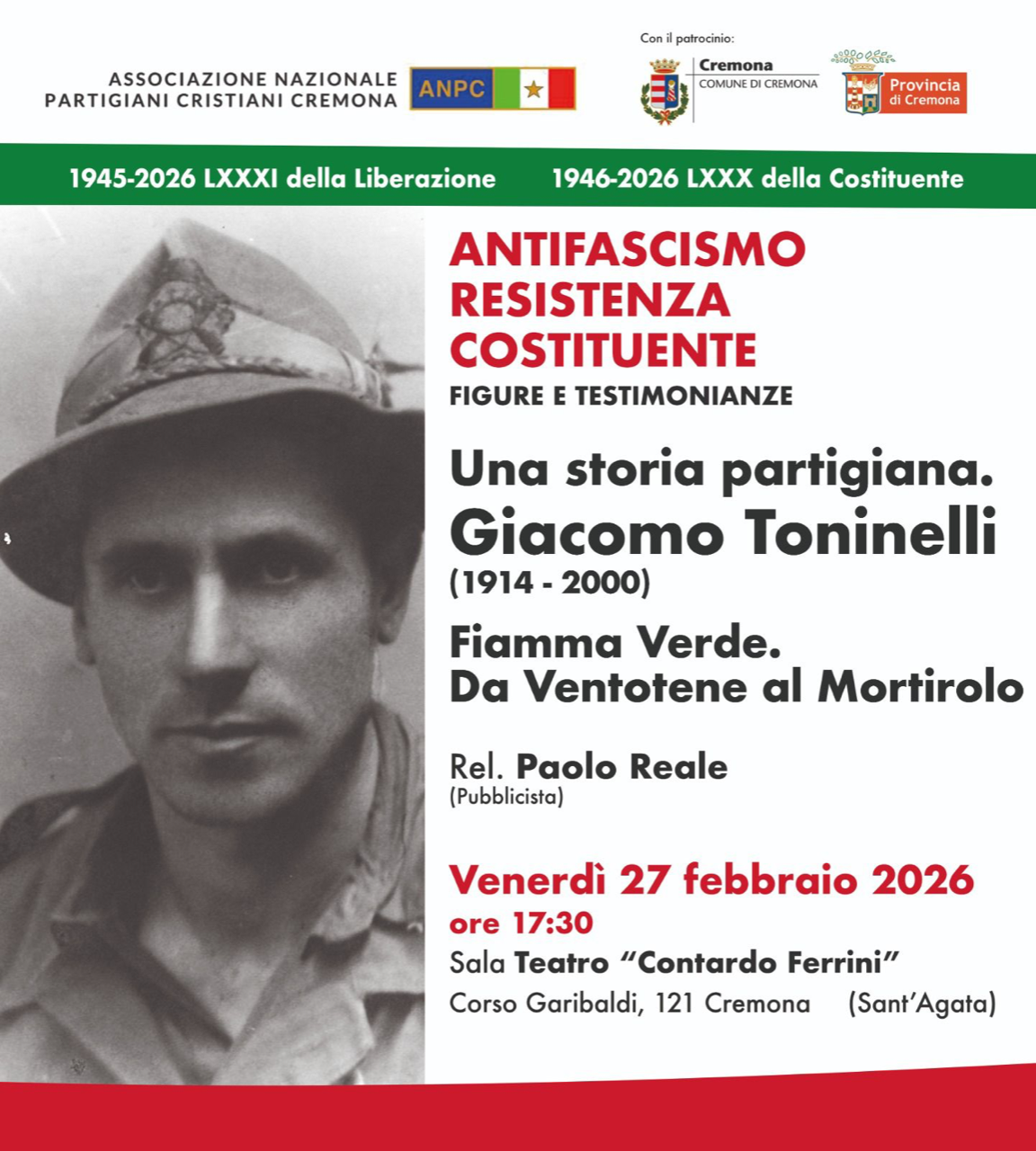 Venerdì 27 febbraio, alle 17.30 presso la sala teatro “Contardo Ferrini” della parrocchia di S. Agata, a Cremona, si terrà il quinto incontro del ciclo promosso dalla sezione cremonese dell’Associazione nazionale partigiani cristiani e incentrato sulla figura di partigiano cremonese Giacomo Toninelli, a cura di Paolo Reale, che racconterà quanto noto della vicenda biografica di questo partigiano cremonese, noto con il nome di battaglia Cremona.