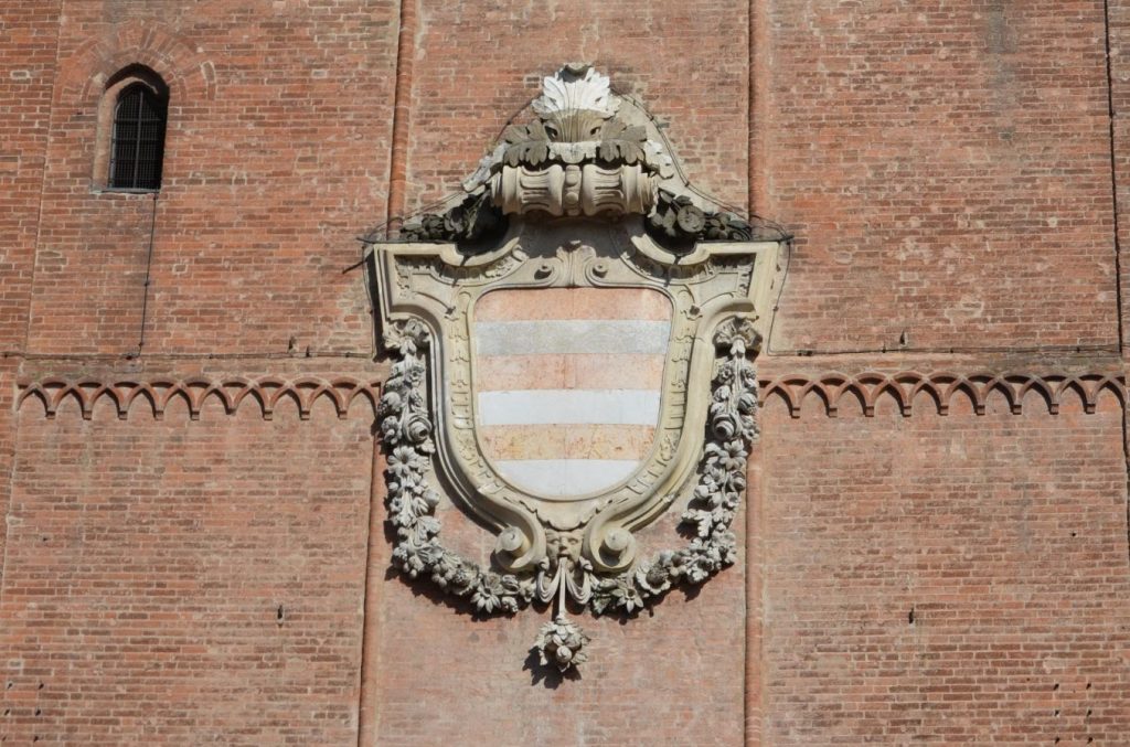Incastonato nella tessitura medievale del Torrazzo lo stemma rappresenta la città fin dal XIV secolo. La relazione tecnica mette in luce che per riprodurre i colori araldici della città gli antichi maestri scelsero di affidarsi alla varietà cromatica delle rocce: il rosso verona per la fascia orizzontale (questa pietra è molto presente anche nei pavimenti della Cattedrale e nei Leoni stilofori agli ingressi), il marmo bianco di Carrara per le sezioni argentee, un marmo bianco dorato per la cornice finemente lavorata e una pietra calcarea più tenera per la ricca ghirlanda di fiori e frutti che avvolge lo scudo.