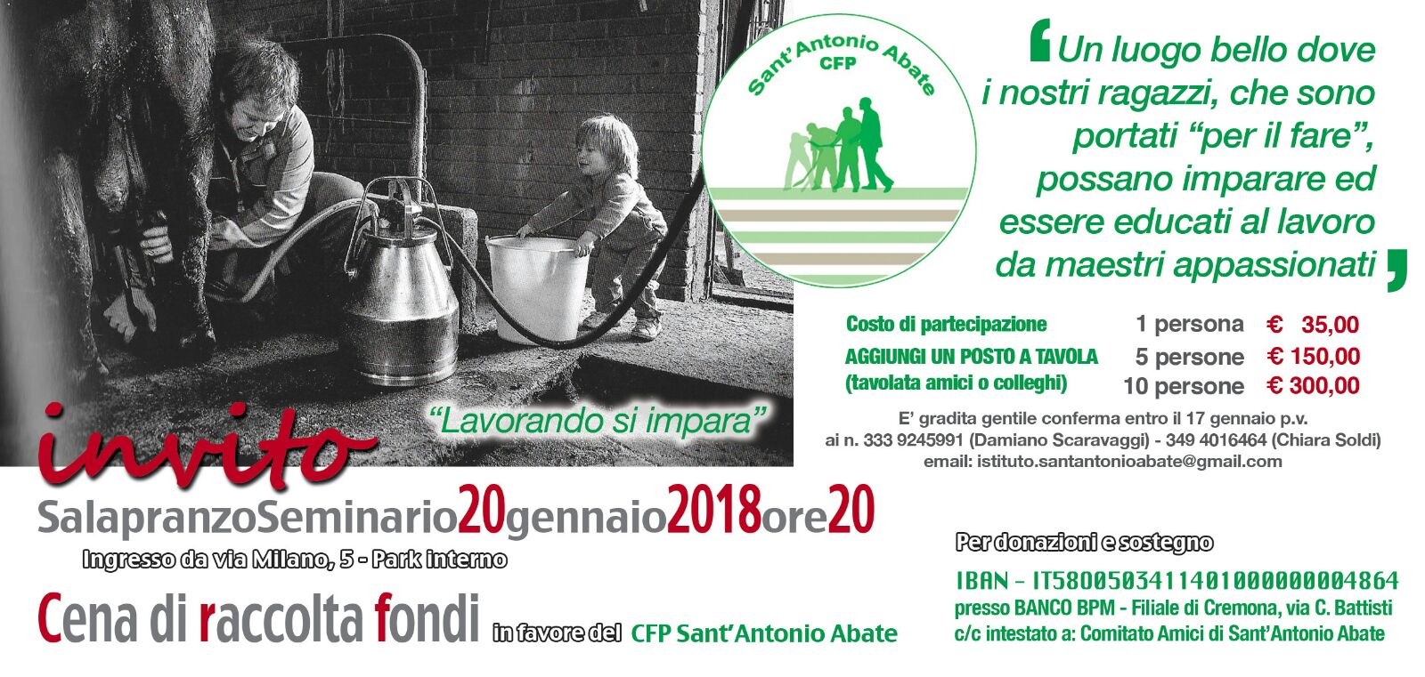 Inoltre, a sostegno della nuova scuola, la sera di sabato 20 gennaio si terrà una cena di raccolta fondi presso il Seminario di Cremona. Costo di partecipazione 35 euro a persona, con agevolazioni per gruppi: 5 persone 150 euro, 10 persone 300 euro. Prenotazioni entro il 17 gennaio telefonando al 333-9245991 o 349-4016464 oppure inviando una e-mail a istituto.santantonioabate@gmail.com .