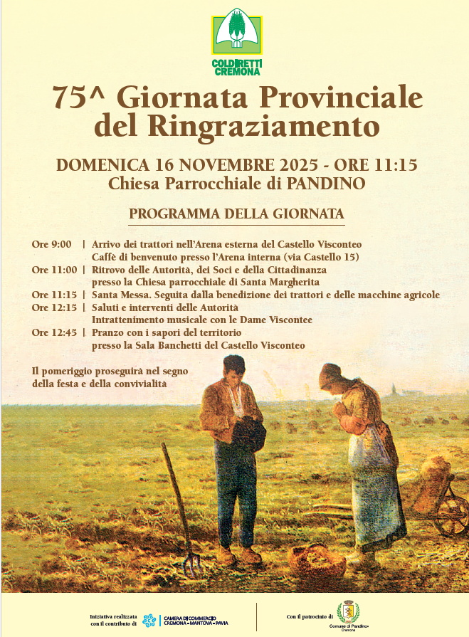 È da sempre uno degli appuntamenti più attesi e preziosi per gli agricoltori e per le famiglie che vivono del lavoro dei campi e degli allevamenti. Cuore della domenica sarà la celebrazione della Messa, alle ore 11.15 presso la chiesa parrocchiale di Santa Margherita a Pandino, alla presenza degli imprenditori agricoli con le loro famiglie, dei rappresentanti delle Istituzioni e del tessuto produttivo della provincia di Cremona, insieme a tutta la comunità.