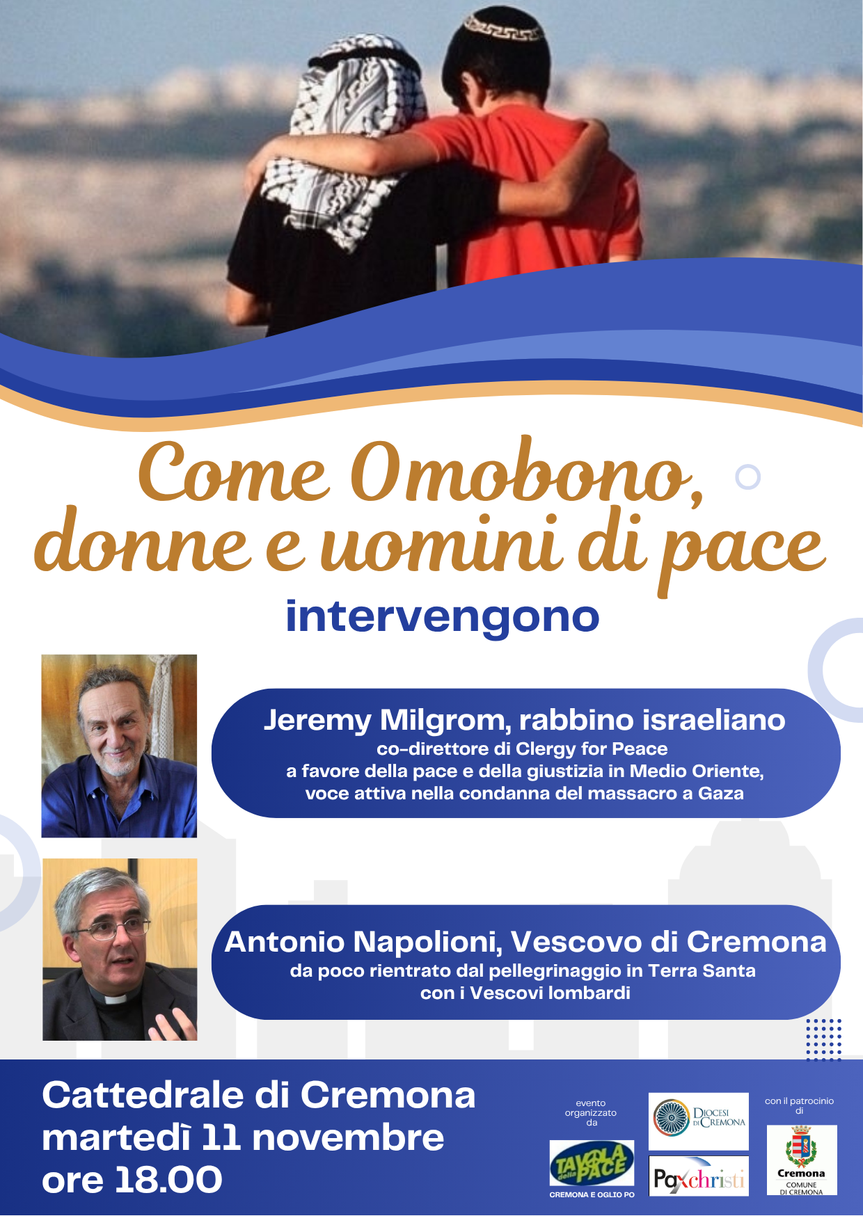 Alla vigilia della festa patronale di sant’Omobono, patrono della città e della diocesi di Cremona, celebre per il suo ruolo di mediatore tra le fazioni che dividevano la Cremona medievale, il tema della pace sarà al centro dell’incontro in programma a Cremona nel pomeriggio di martedì 11 novembre, alle ore 18. Proprio la Cattedrale, che nella sua cripta conserva le spoglie del patrono, sarà la cornice dell’incontro, dal titolo “Come Omobono, donne e uomini di pace”. Interverranno il vescovo Antonio Napolioni e il rabbino Jeremy Milgrom, dopo il saluto istituzionale del sindaco di Cremona Andrea Virgilio.