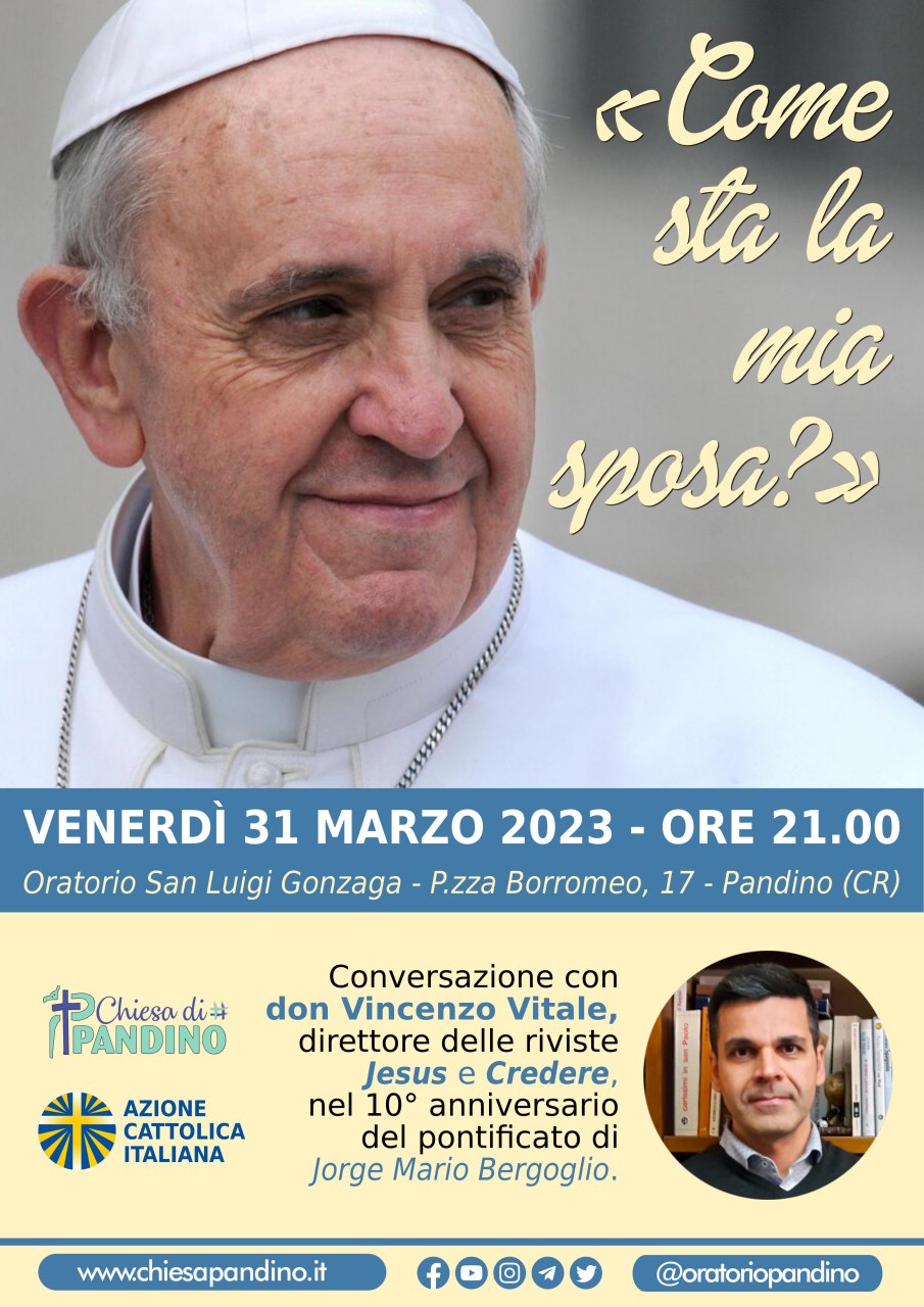 Nell’ambito del decimo anniversario di pontificato di Papa Francesco, la parrocchia di Pandino organizza, venerdì 31 marzo alle 21, l’incontro «Come sta la mia sposa?».