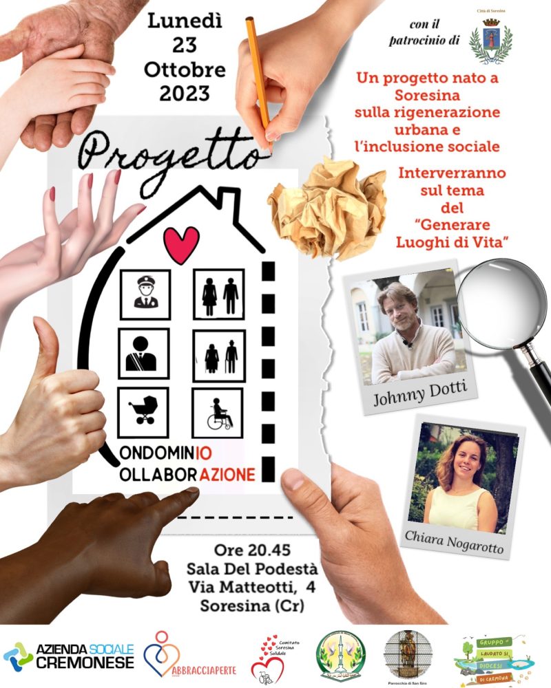 Lunedì 23 ottobre, alle ore 20.45, nella sala del Podestà di Soresina, srrà presentato il progetto “Condomin-io collabor-azione” che unisce rigenerazione urbana, inclusione, multiculturalità. Il condominio è il contenitore di tutto questo. Una comunità in piccolo che necessità sempre di più di fare rete con chi ci vive e con la città che sta intorno. In un mondo globalizzato c’è necessità di aprirsi a nuove storie di vita che devono essere raccontate e comprese affinché non portino alla costruzione di nuovi ghetti.
