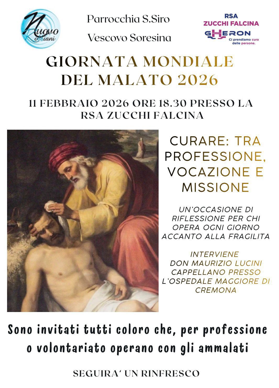 In occasione della Giornata mondiale del malato 2026, la Parrocchia di Soresina, in collaborazione con la RSA Zucchi Falcina e con il Polo Sanitario Nuovo Robbiani, propone un incontro dedicato al tema “Curare: tra professione, vocazione e missione” rivolto alle persone che, per professione o per volontariato, si prendono cura delle persone ammalate.