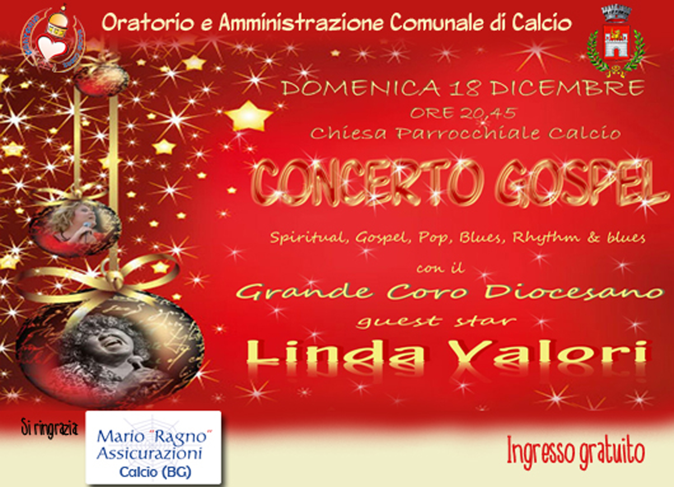 Domenica 18 dicembre alle 20.45 nella chiesa arcipretale di Calcio (Bg) si terrà il concerto Gospel promosso dall’Oratorio in collaborazione con l’amministrazione comunale di Calcio. Un concerto che avrà per protagonisti il Grande Coro Diocesano dei Giovani e alcuni artisti conosciuti nel mondo dello spettacolo, quali Linda Valori (cantante), Lorenzo Cannelli (pianista), e che sarà condotto da Mauro Labellarte di area Hope.