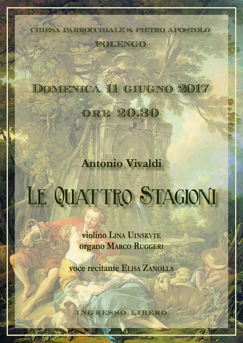 La celebre composizione di Antonio Vivaldi appartiene alla raccolta “Il cimento dell’armonia e dell’invenzione” op. VIII, pubblicata nel 1725. Il compositore ha rappresentato attraverso la musica immagini e situazioni tratti da quattro sonetti, ciascuno dedicato ad una stagione, che in occasione del concerto dell’11 giugno a Polengo, verranno recitati dall’attrice Elisa Zanolla.