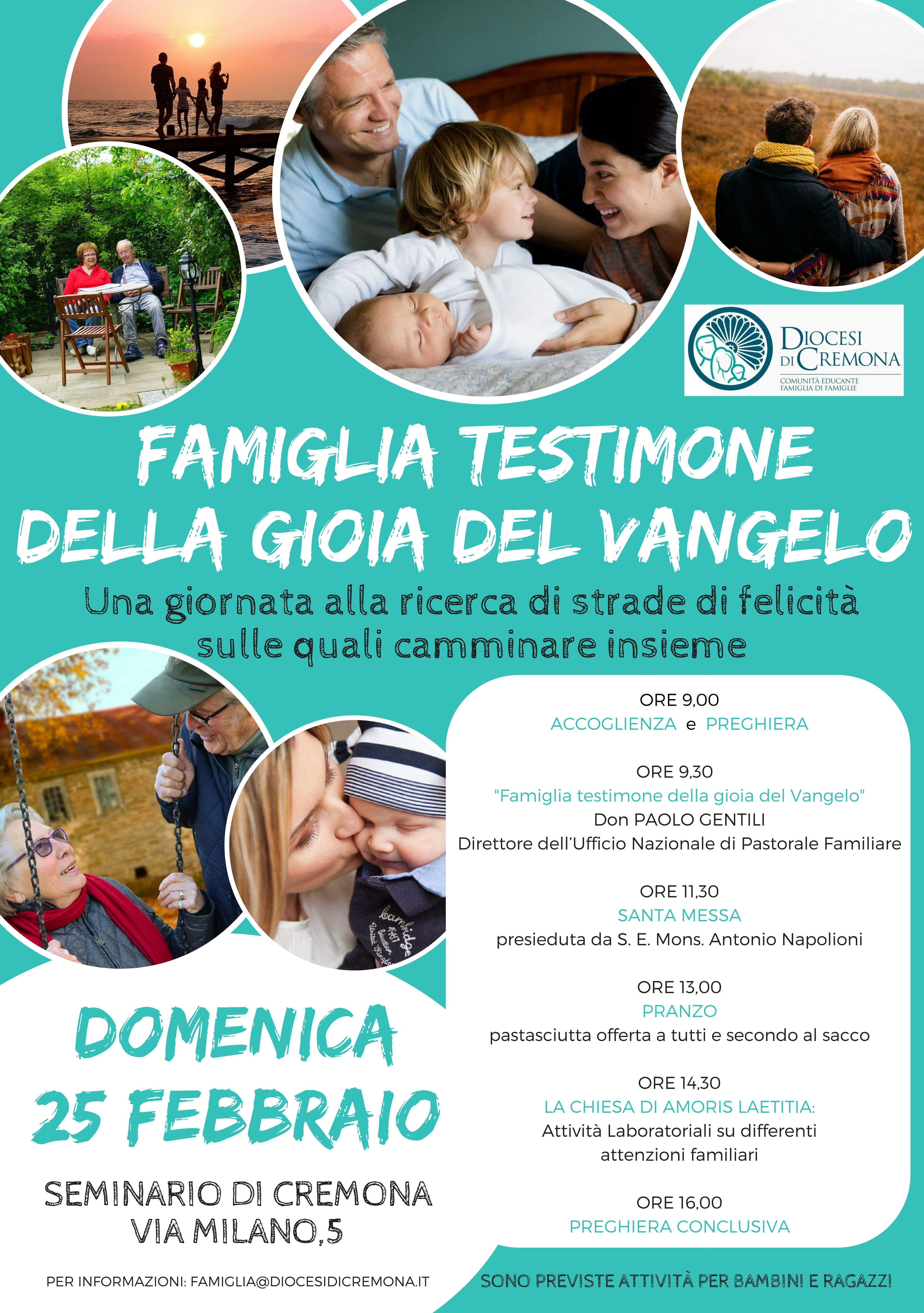 Una domenica speciale, da trascorrere insieme ad altre coppie e famiglie che desiderano conoscere o riscoprire la propria identità e missione. Si annuncia così la giornata organizzata, per domenica 25 febbraio a Cremona, presso il Seminario (dalle ore 9 alle 16), dall’Ufficio diocesano per la pastorale familiare. Il momento di approfondimento sul tema “Famiglia testimone della gioia del Vangelo” sarà anche l’occasione per incontrarsi e condividere la gioia dell’essere “famiglia di famiglie”.