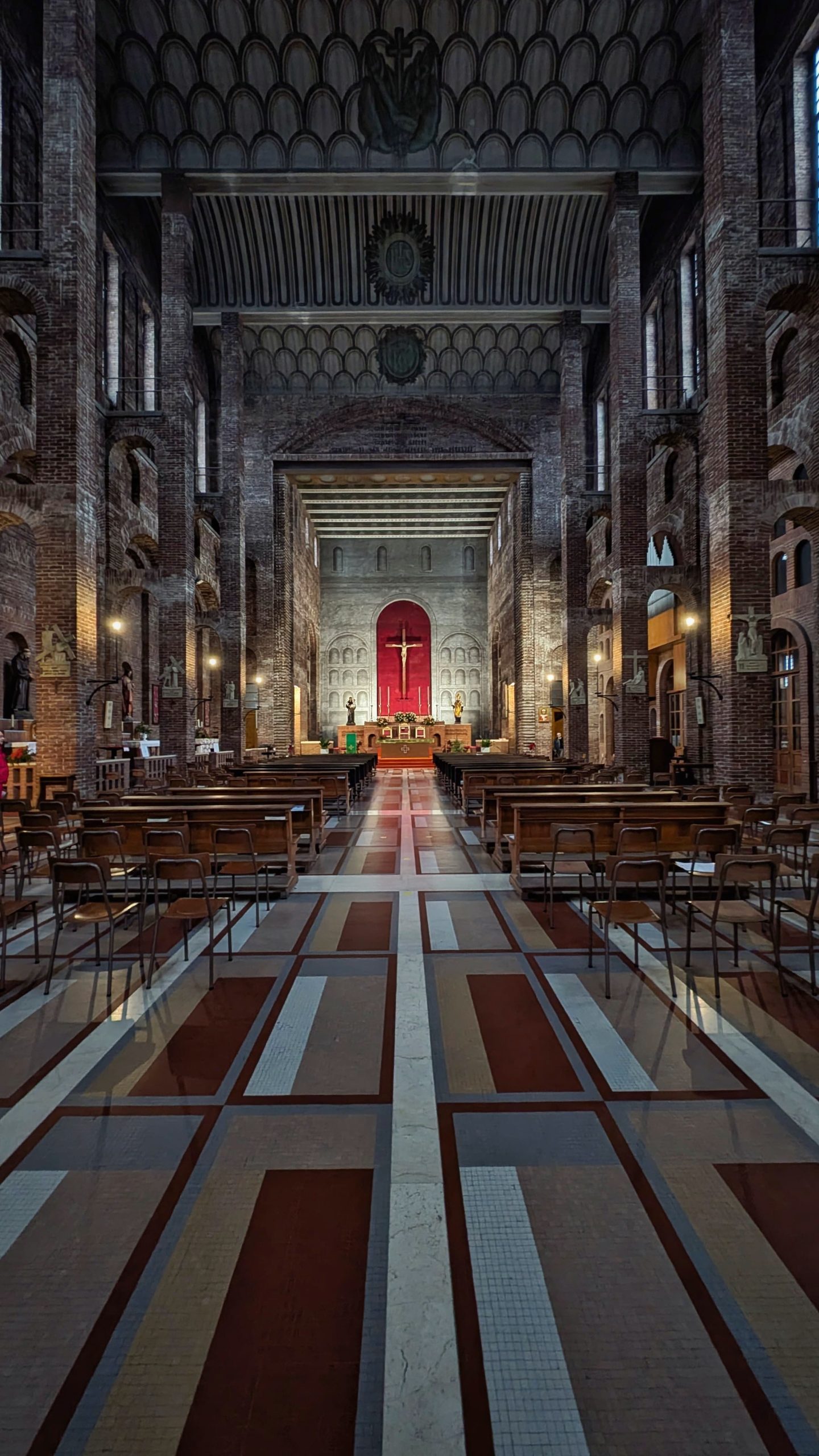 La copertura è composta da sette voltine a botte, interamente realizzate in cotto armato e appoggiate sui pilastri binati, decorate con disegni geometrici, simboli cristiani e dell’Ordine francescano.