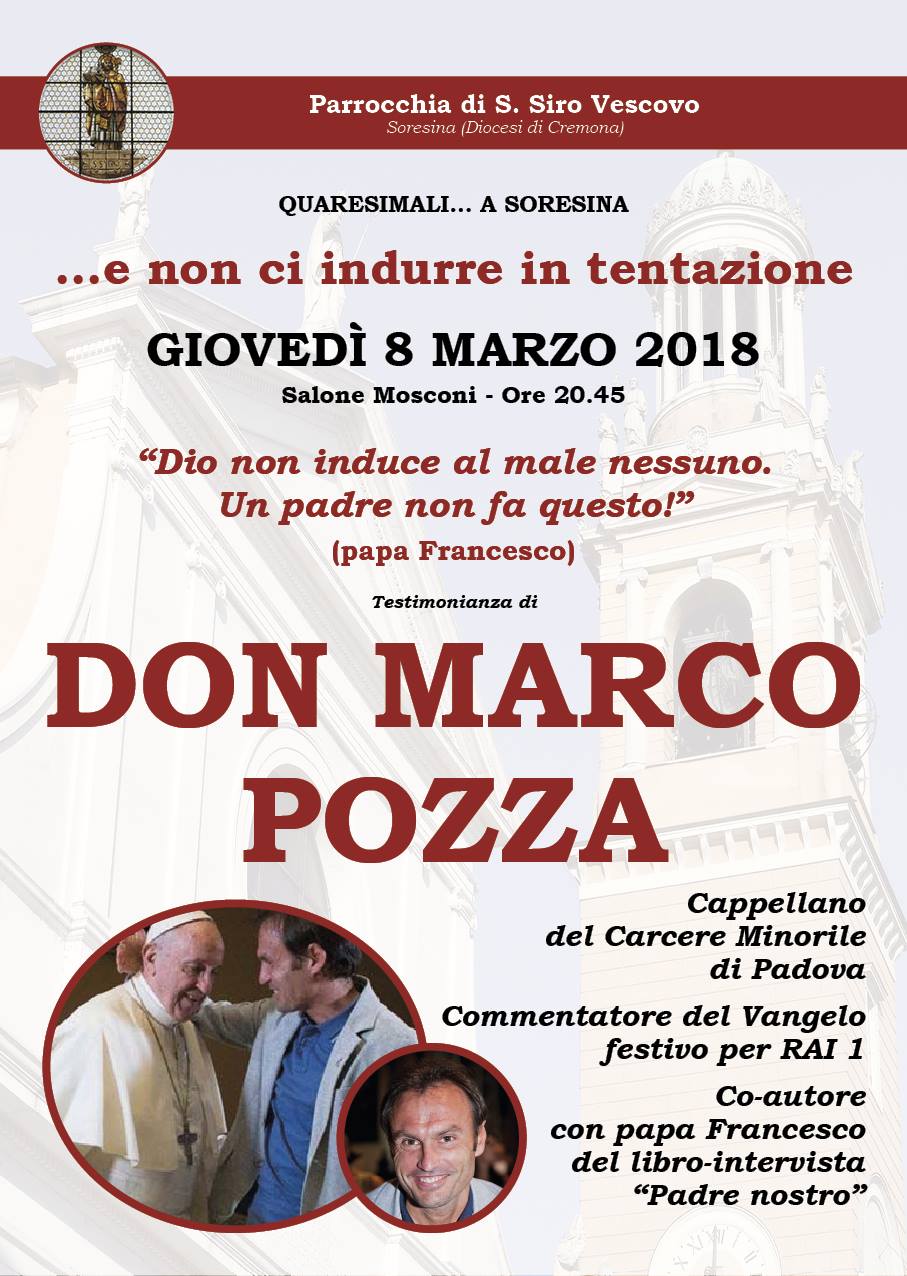 Sarà don Marco Pozza – volto televisivo noto per il commento del Vangelo il sabato pomeriggio nella trasmissione “A sua immagine” di Rai1 e che per TV2000 ha condotto, in nove puntate, il programma “Padre nostro”, una sorta di conversazione con papa Francesco sulla preghiera che Gesù – l’ospite che la sera di giovedì 8 marzo interverrà a Soresina ai Quaresimali proposti dalla parrocchia di S. Siro. L’appuntamento è per le 20.45 presso il salone Mosconi del centro parrocchiale.