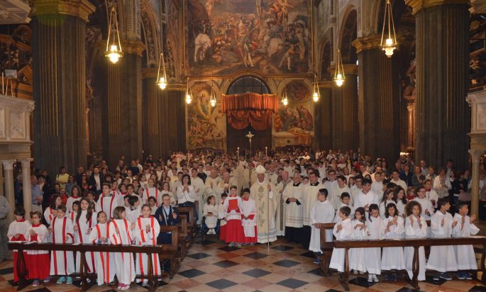 “Ogni tanto durante la Messa lasciatevi distrarre, ma non dallo sternuto del vostro vicino, bensì dalla presenza di Gesù che ci ama. Chiudete gli occhi e gustate il suo essere in mezzo a noi: che bello!». Era proprio a suo agio il vescovo Antonio durante il giubileo dei ministranti che è stato celebrato giovedì 2 giugno in Cattedrale, nella festa della sua dedicazione. Senza mitria, in mezzo ai banchi colmi di bambini e ragazzi nelle vesti liturgiche di diversi colori e fogge, il Vescovo è tornato un poco parroco e, tra una battuta e l’altra, ha fatto riflettere la singolare assemblea su due verbi fondamentali: “servire e adorare”.