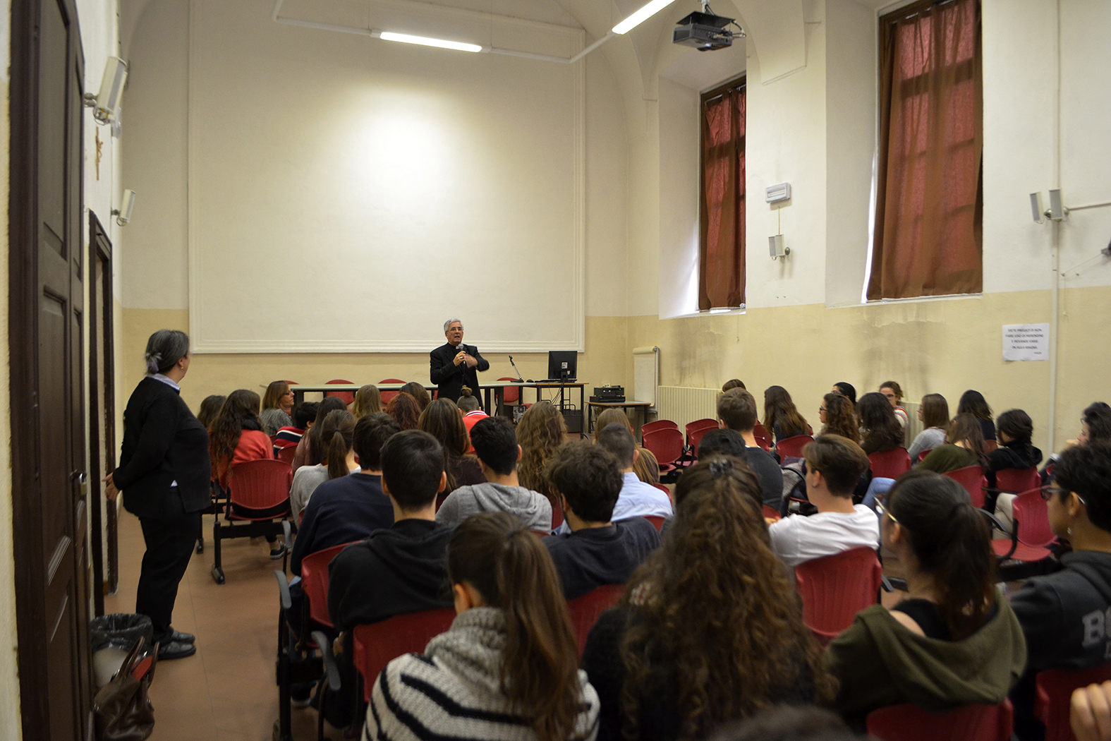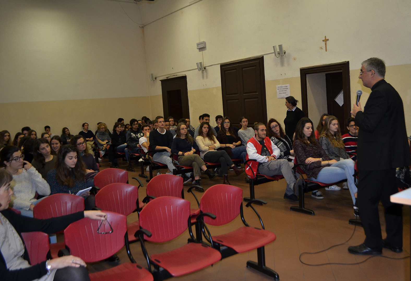 Essendo in un liceo classico-linguistico ovviamente non potevano mancare i grandi interrogativi sul dibattito Fede e Scienza. Metafora interessante quella utilizzata per spiegare il rapporto tra questi due pilastri della vita dell’uomo: tutto ciò che serve è immaginare la ragione come un essere in grado di spostarsi solo tramite due ali. Da una parte esiste la Scienza, che si interroga su come realmente si siano verificati determinati eventi, e dall’altra la Fede, ala che mira a spiegare il perché di questi episodi e in particolare le ripercussioni che hanno avuto sugli uomini. Se esse collaborano nella giusta misura, sono in grado di descrivere una traiettoria in grado di guidare l’uomo nel cammino della sua vita. Aspetto curioso è però il punto di partenza e di arrivo di questa traiettoria, che sembra essere sempre lo stesso: Cristo Gesù. E’ proprio nel sacrificio di Cristo che l’uomo può trovare sé stesso e non limitarsi ad accontentarsi di ciò che già possiede.