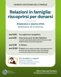 Da qui prende le mosse la Giornata diocesana delle famiglie, promossa dalla Pastorale famigliare della Diocesi di Cremona, che torna anche nell’edizione 2026 con l’evento fissato per domenica 1° marzo in Seminario, a Cremona: una mattinata di approfondimento e confronto dal titolo “Le relazioni in famiglia: riscoprirsi per donarsi”, per ricordarsi che Gesù abita nelle nostre case e abita le nostre relazioni. Ciò significa tornare alle origini della propria vocazione per essere autenticamente uniti a Cristo nella quotidianità del proprio essere famiglia nel mondo e nella comunità cristiana.