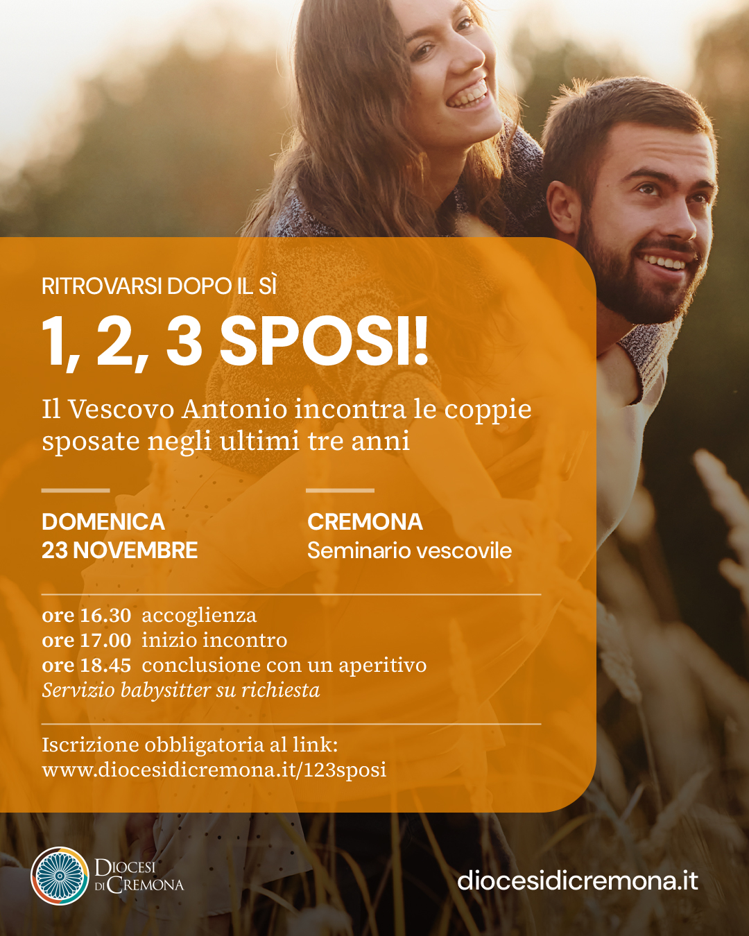 “1, 2, 3 sposi… Ritrovarsi dopo il sì”. È lo slogan dell’incontro che sarà proposto nel pomeriggio di domenica 23 novembre, dalle 16.30 presso il Seminario vescovile di Cremona, alle coppie che si sono sposate tra il 2021 ed il 2025. Un momento di amicizia e riflessione sul cammino iniziato come giovani sposi proposto dalla Pastorale familiare e che vedrà la presenza anche del vescovo Antonio Napolioni.