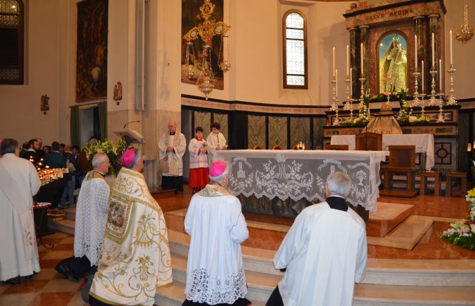 In fondo, dietro i ministranti, i sacerdoti: mons. Amedeo Ferrari, parroco di Castelleone e rettore del Santuario e i vescovi Dante Lafranconi e Antonio Napolioni. Quindi le autorità del paese: il sindaco Pietro Fiori insieme ai comandanti delle locale stazione dei carabinieri e della polizia locale.