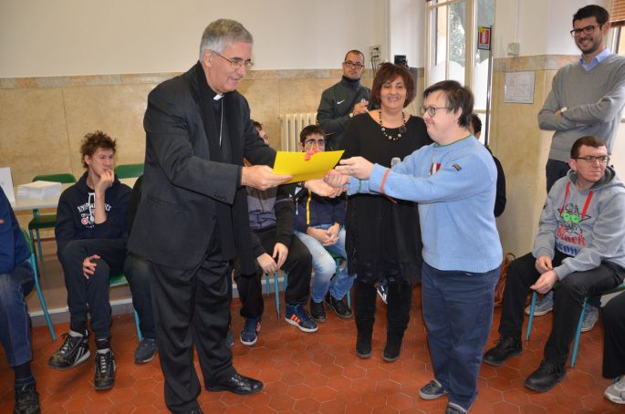 Mons. Napolioni si è lasciato travolgere da tanta simpatia e dopo aver intonato un canto di gioia ha ringraziato i ragazzi e i loro familiari presenti in massa: «Sapete qual è il vostro segreto? Il vostro contributo per tutti? – ha esordito nel suo saluto – Voi ci smuovete dal nostro modo di pensare la vita, di credere che sia importante correre e fare tante cose invece che fermarci e farci abbracciare. Voi ci insegnate ciò che è essenziale davvero». Il presule ha avuto anche parole di ammirazione e di incoraggiamento non solo per gli operatori e i volontari della cooperativa, ma anche per i familiari degli utenti, che spesso vivono momenti di scoraggiamento e dolore. L’incontro si è concluso con la visita ai locali e un ricco rinfresco molto apprezzato dai ragazzi.
