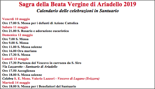Dunque domenica 12 maggio, in occasione della sagra della Beata Vergine di Ariadello, il santuario sarà aperto e saranno celebrate Messe alle 7, alle 9, alle 11 e alle 17.30. Alle 16 è fissata l’ora mariana. Lunedì 11 maggio, giorno del “feren” particolarmente sentito e molto frequentato, la Messa solenne al Santuario sarà celebrata dal vescovo di Lugano mons. Valerio Lazzeri, che raggiungerà il Santuario in carrozza, lunga la via campestre che congiunge la città ad Ariadello. Dopo un breve momento di accoglienza, alle 18 sarà celebrata la Messa.