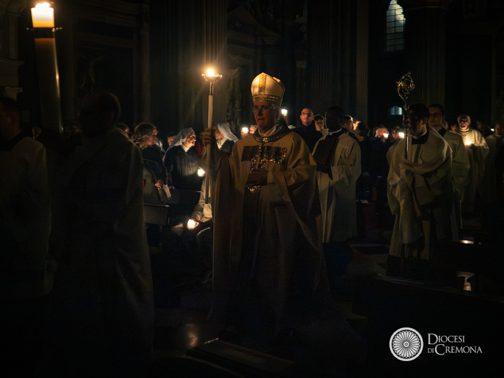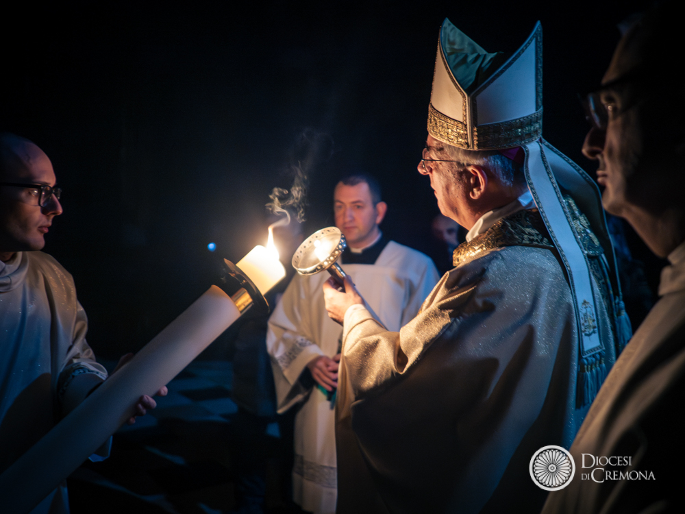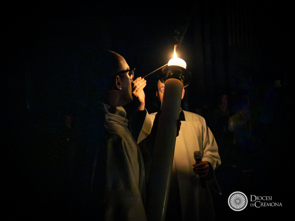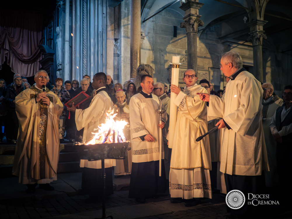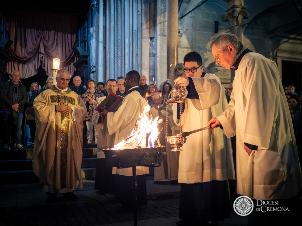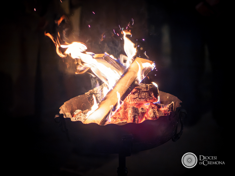 La luce si accende. Davanti alla Cattedrale di Cremona, il fuoco della Pasqua ha aperto un varco di luce e di calore nel buio della piazza. Attorno alle fiamme la comunità è entrata nel mistero della notte della Risurrezione per incontrare, attraverso i segni della liturgia, il cuore del mistero cristiano.