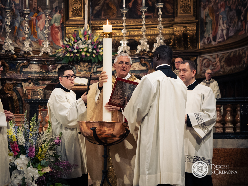O alto e glorioso Dio, illumina le tenebre del cuore mio: sono le parole della preghiera di san Francesco, affidate alla Chiesa di Cremona dalla riflessione del vescovo Antoni Napolioni durante la Veglia di Pasqua. “La luce, che è la prima creatura, è l’inizio della vita, è il simbolo della vicinanza di Dio a noi. E poi la parola, che alimenta la fede, la speranza. E poi il pane, che diventa carità”: i segni che la solenne liturgia della notte di Pasqua guidano lo sguardo e la preghiera dei fedeli.