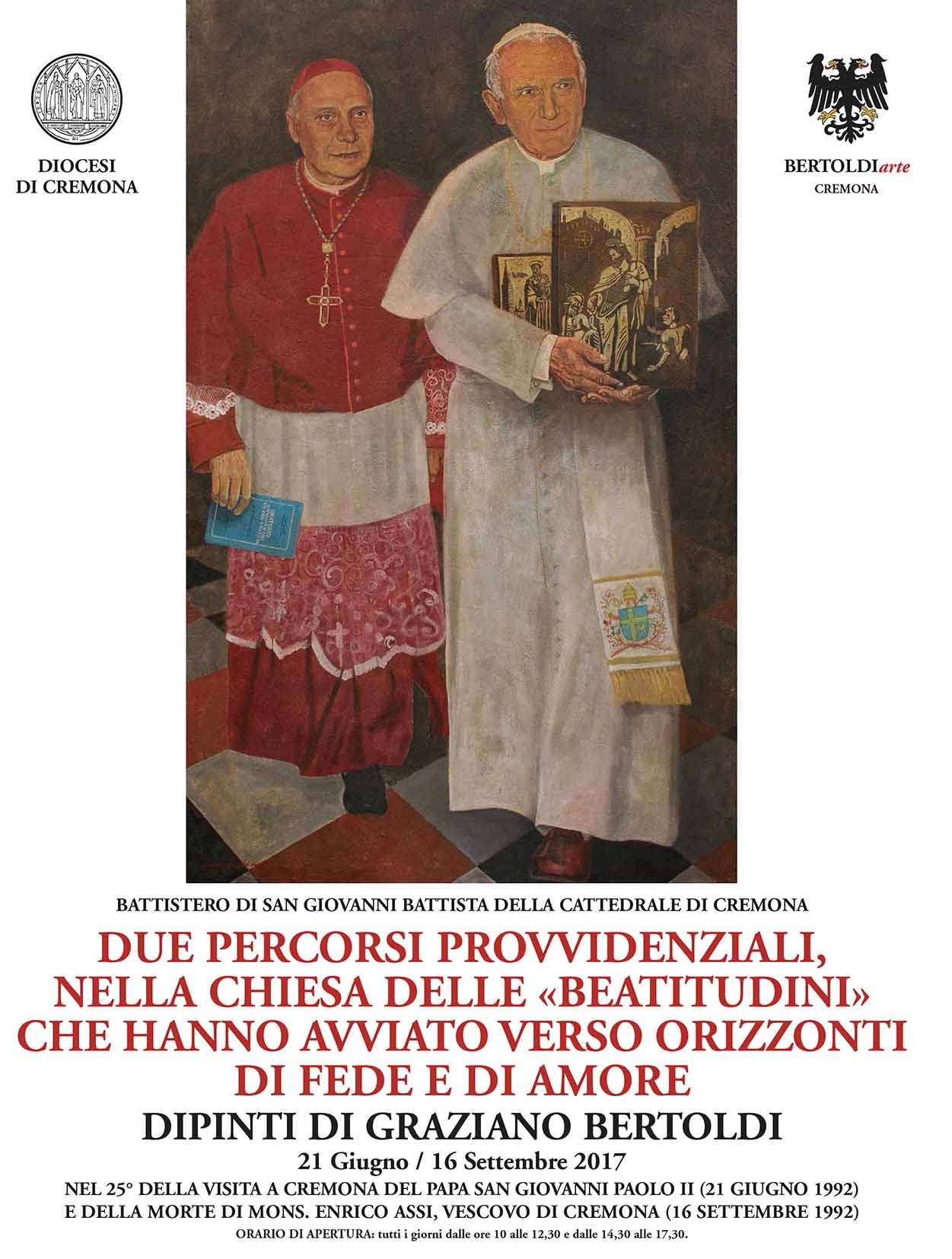 Proseguirà sino al 16 settembre nel Battistero di Cremona la mostra, curata da Bertoldiarte e inaugurata il 21 giugno scorso, con l’esposizione di dipinti dell’artista cremonese Graziano Bertoldi per ricordare due significativi eventi: il 25esimo anniversario della visita di San Giovanni Paolo II a Cremona e la morte del vescovo Enrico Assi.