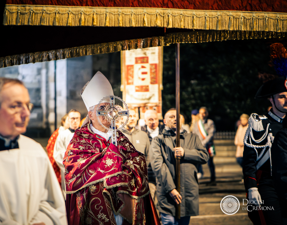 Alle ore 21 il via dalla Cattedrale, alla presenza delle autorità cittadine. Il corteo si è snodato lungo il consueto percorso: da piazza del Comune in largo Boccaccino, quindi via Mercatello, corso Mazzini, piazza Roma (lato sud), corso Cavour, via Verdi, piazza Stradivari, via Baldesio, per fare infine ritorno in piazza del Comune. La conclusione si è svolta in Cattedrale, con l’omelia del Vescovo e la benedizione impartita con la reliquia.