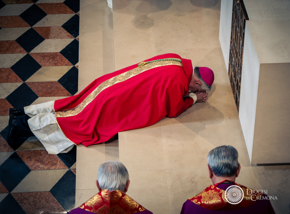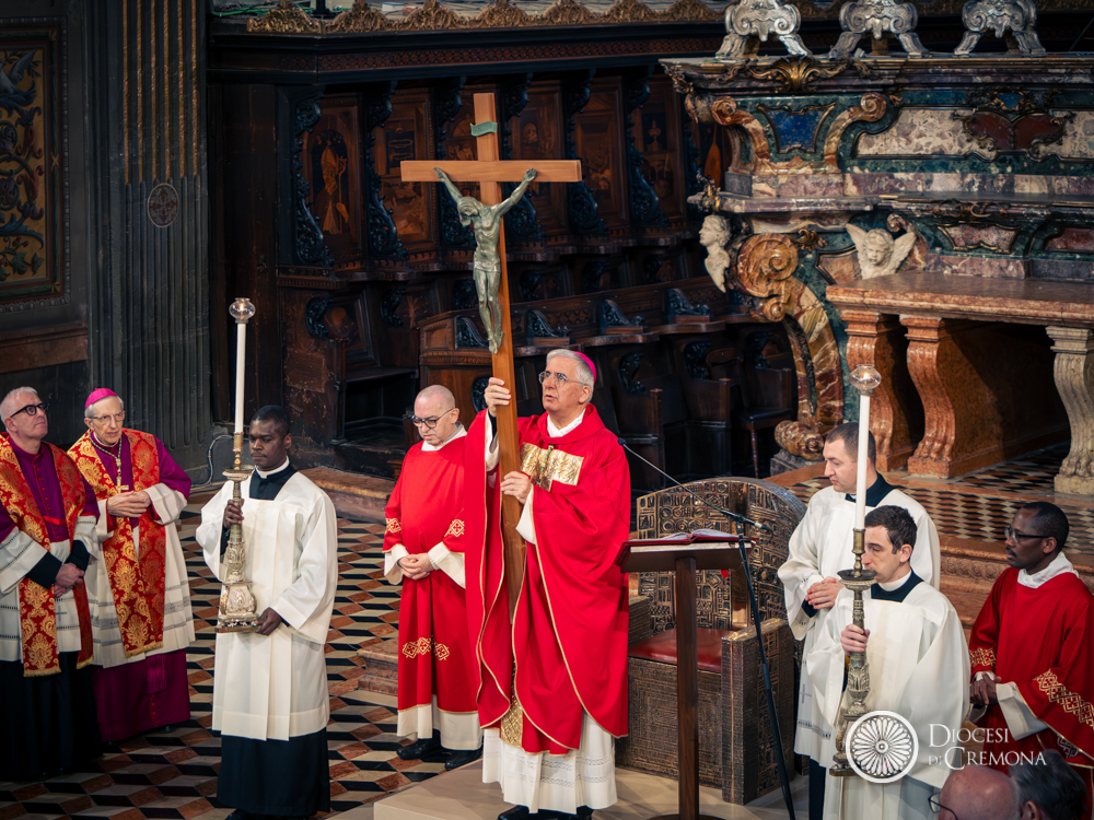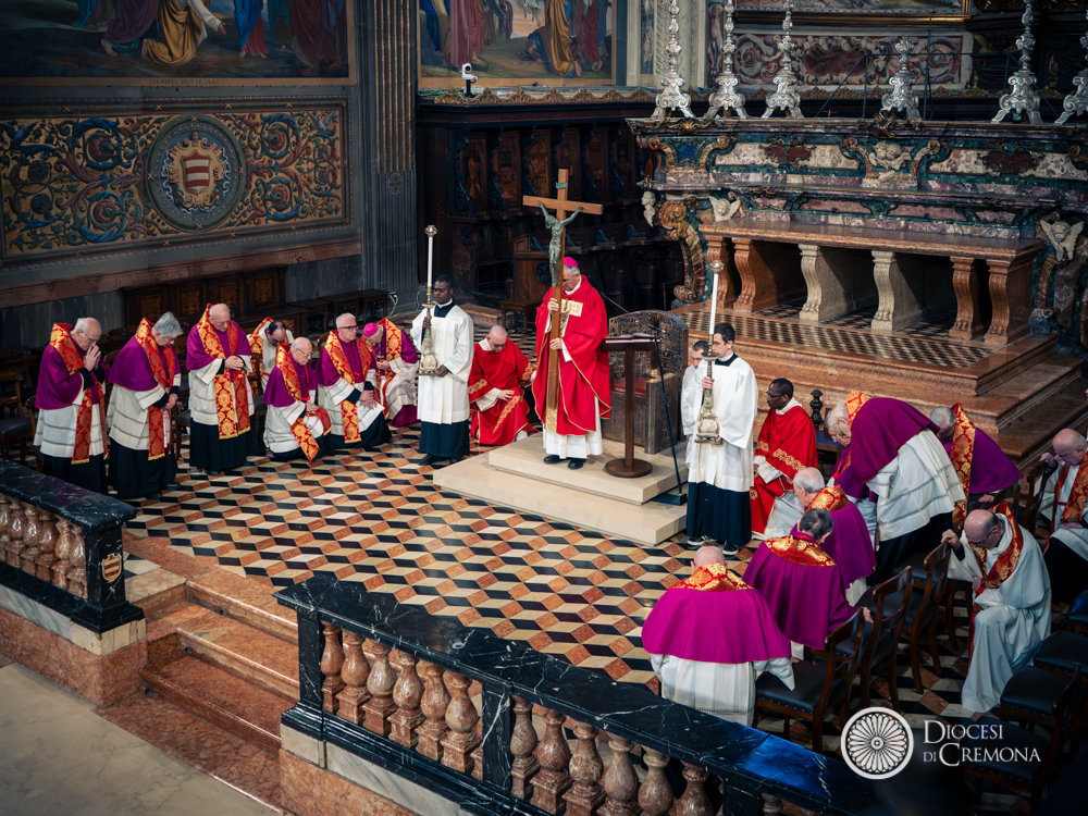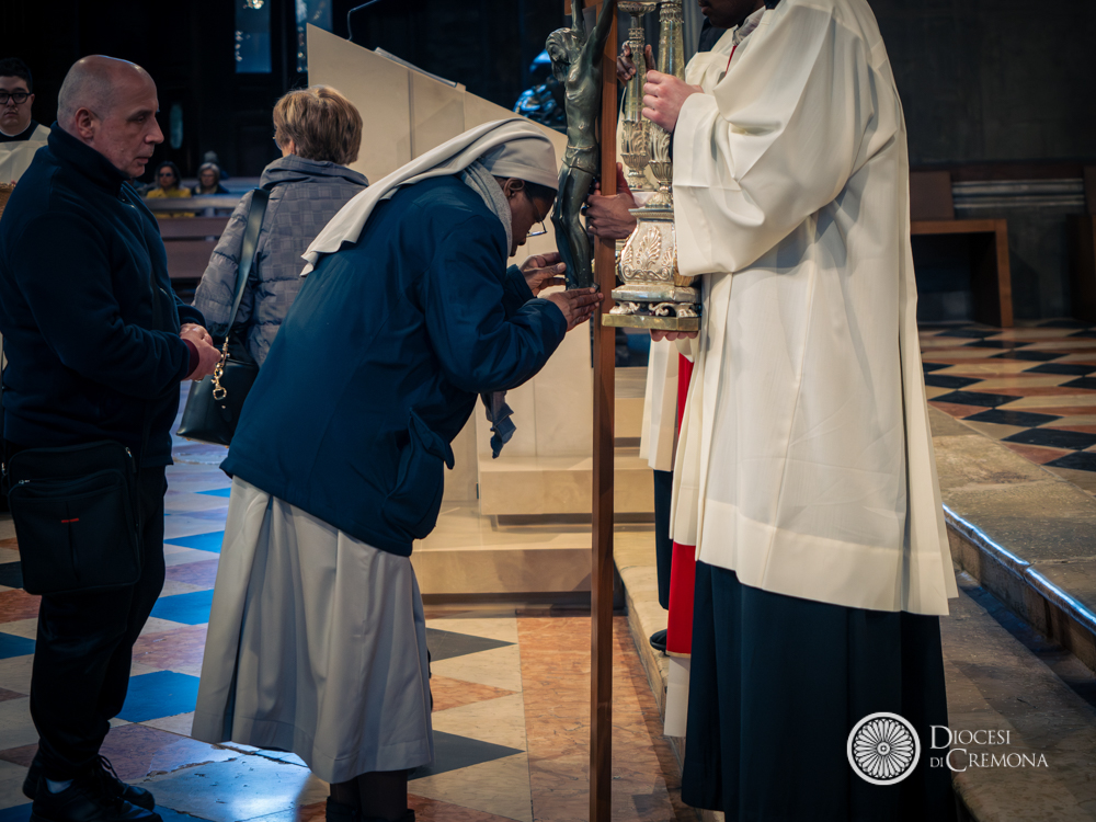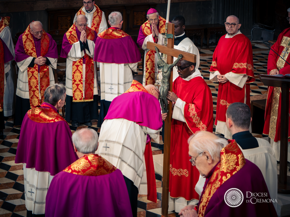 Altare spoglio, silenzio raccolto. Nel pomeriggio di venerdì 3 aprile nella Cattedrale di Cremona monsignor Antonio Napolioni ha presieduto l’Azione liturgica della Passione e Morte del Signore. La celebrazione si è aperta con la Liturgia della Parola: la profezia del Servo sofferente in Isaia e la lettera agli Ebrei hanno introdotto la narrazione della Passione secondo Giovanni.