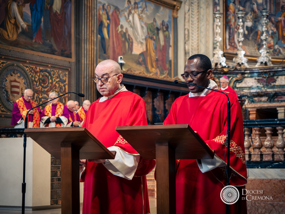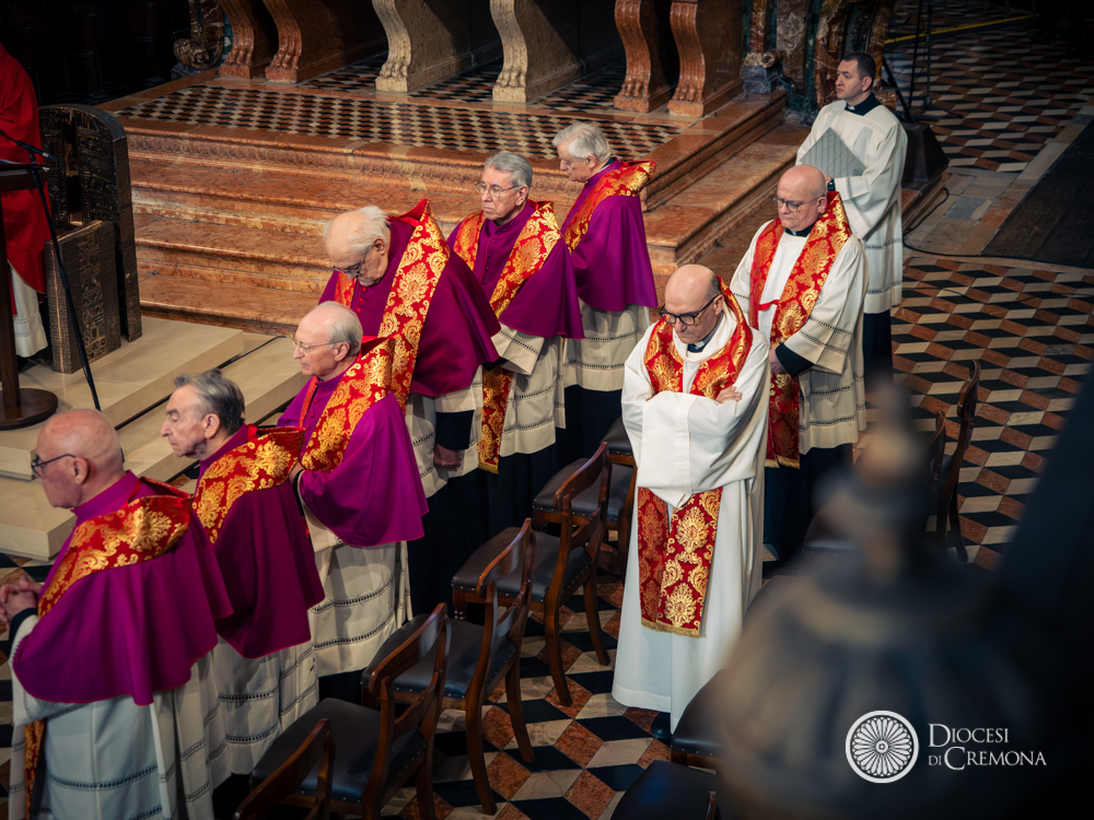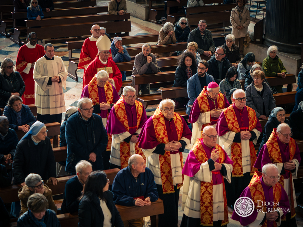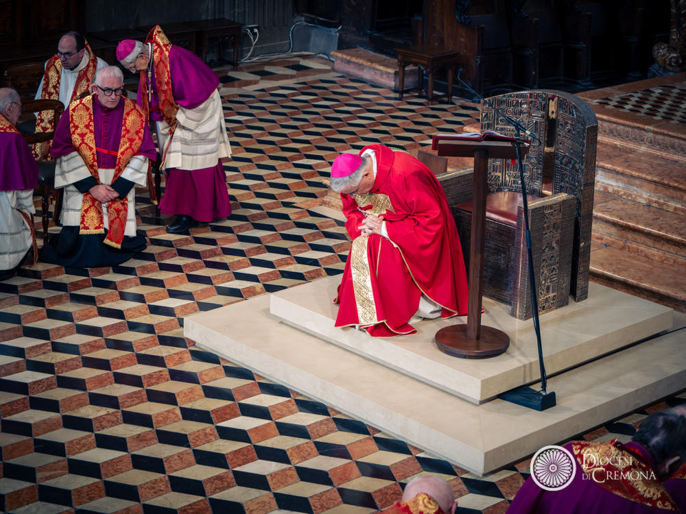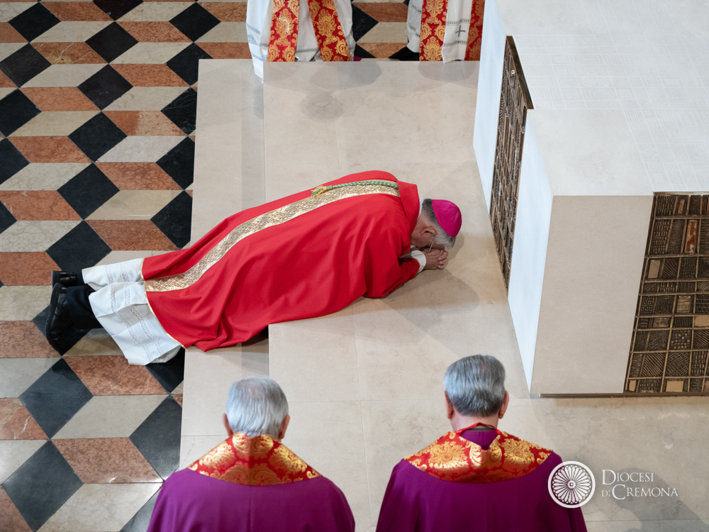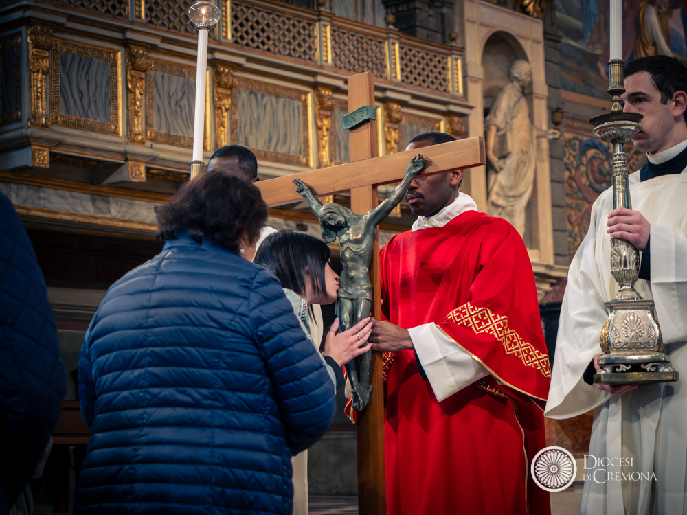 Altare spoglio, silenzio raccolto. Nel pomeriggio di venerdì 3 aprile nella Cattedrale di Cremona monsignor Antonio Napolioni ha presieduto l’Azione liturgica della Passione e Morte del Signore. La celebrazione si è aperta con la Liturgia della Parola: la profezia del Servo sofferente in Isaia e la lettera agli Ebrei hanno introdotto la narrazione della Passione secondo Giovanni.