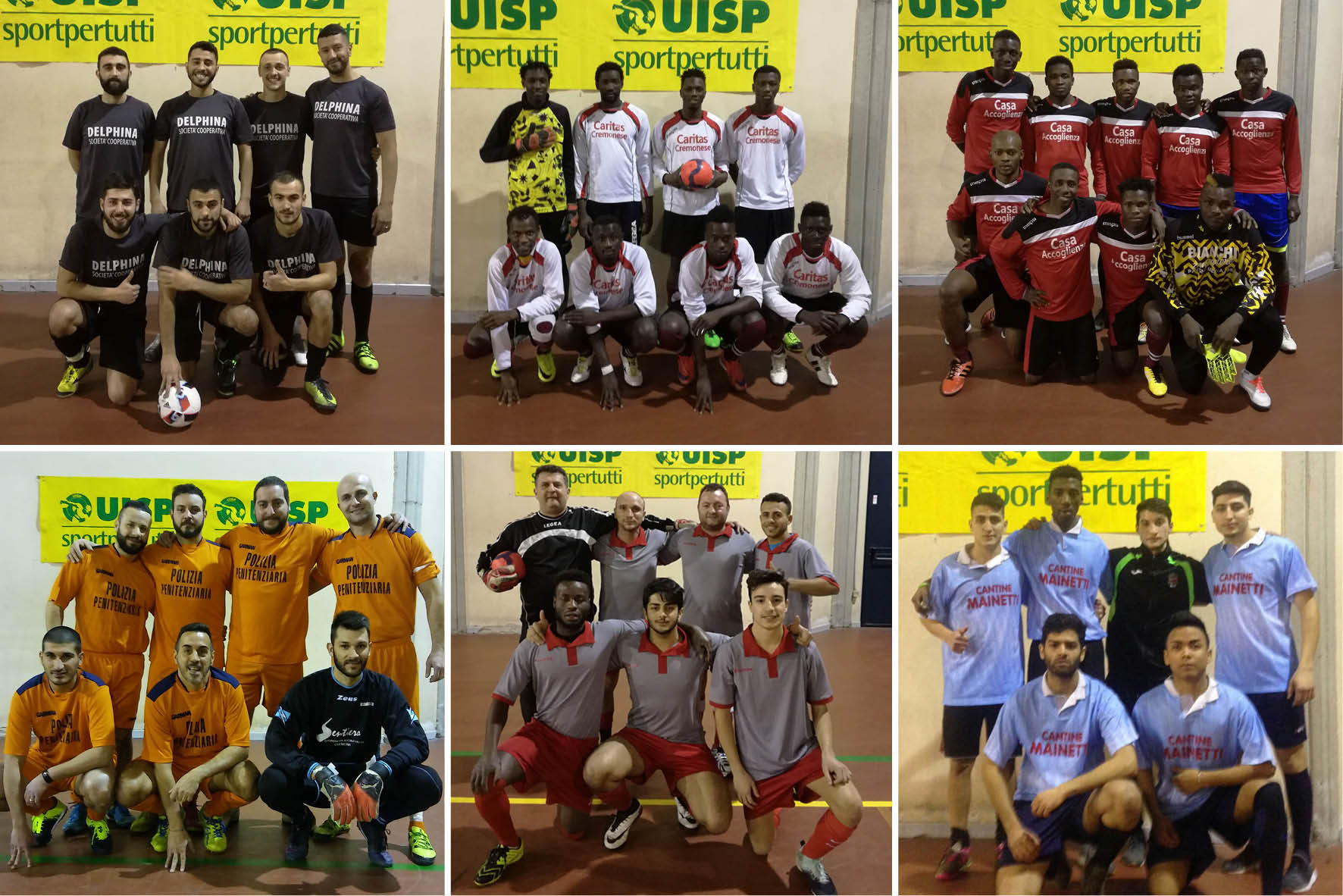 Qui sotto le sei squadre formazioni: Sreet Kambo, le due squadre della Casa dell’Accoglienza, Fiamme Azzurre, Rappr. Cremona Calcio e Sreet Bros.
