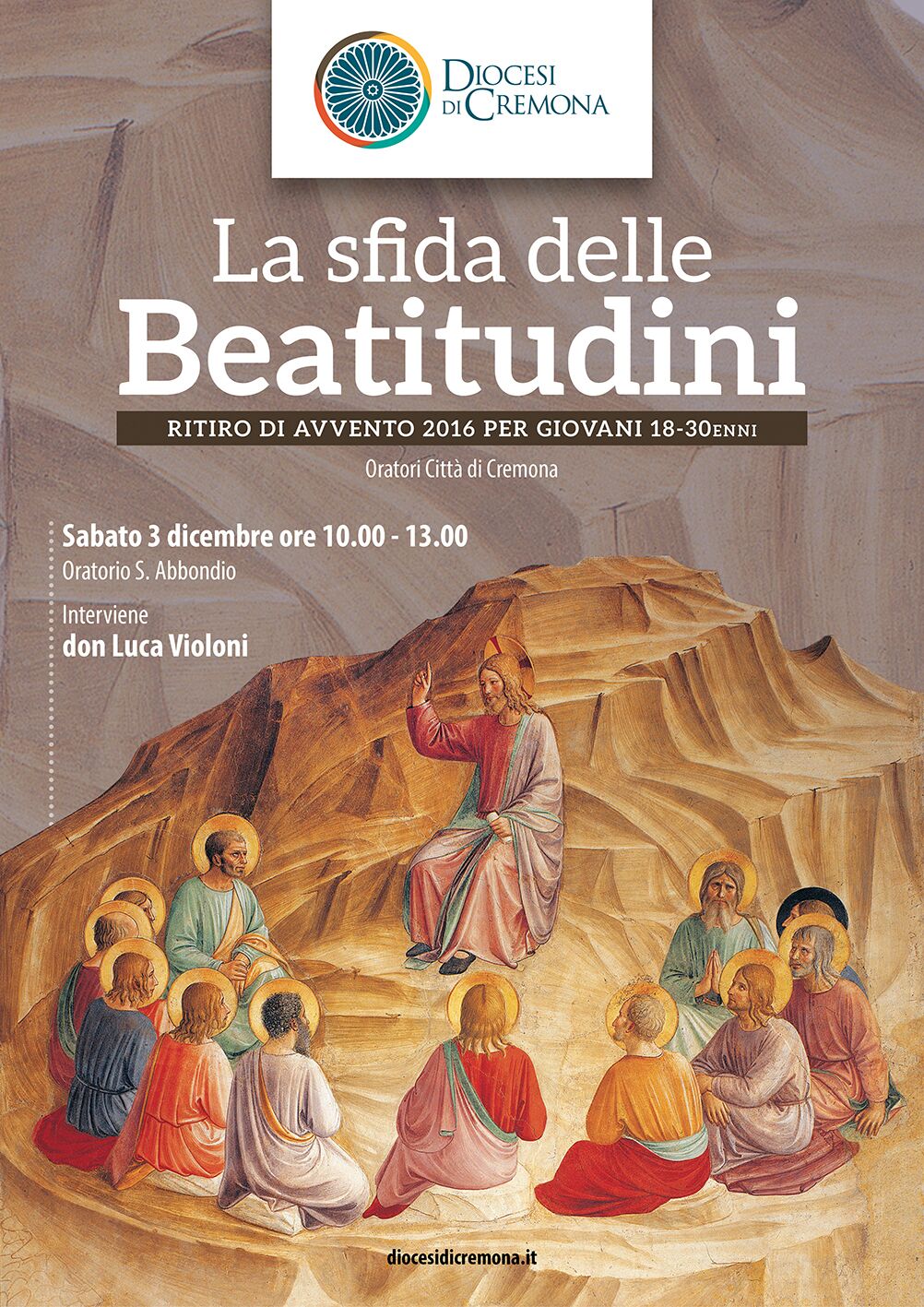 «La sfida delle Beatitudini». È questo il titolo del ritiro di Avvento per giovani dai 18 ai 30 anni delle parrocchie della città di Cremona che si terrà sabato 3 dicembre dalle 10 alle 13 presso il suggestivo chiostro della chiesa di Sant’Abbondio. La mattinata di intensa spirituale sarà caratterizzata dalla meditazione di don Luca Violoni, sacerdote ambrosiano e saggista, dalla preghiera personale e dalla condivisione delle proprie riflessioni. Alcuni sacerdoti saranno disponibili per celebrare il sacramento della Riconciliazione.