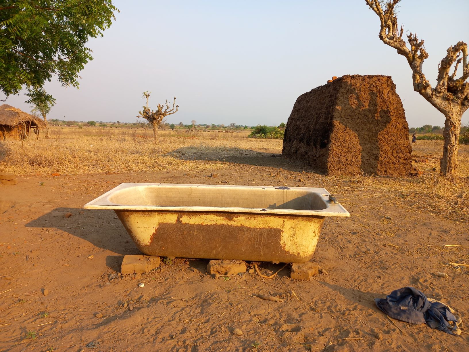 Un pomeriggio, mentre sto visitando i poveri e i malati, noto a distanza una cosa che mi lascia incuriosito: una vasca da bagno… in mezzo alle capanne. «Cosa ci fa una vasca da bagno in mezzo alle capanne?» chiedo ad Emilio, caro amico che mi accompagna. Ci avviciniamo. È una vasca degli anni ’60 quando, in piena epoca coloniale, vivevano qui a Charre alcune famiglie di coloni portoghesi. Sono passati più di cinquant’anni, due guerre – quella di liberazione e quella civile – e la vasca da bagno è ancora lì, appoggiata su alcuni mattoni, in mezzo alla sabbia. Lì di fianco c’è una pila di mattoni cotti. Probabilmente la vasca serve per contenere l’acqua usata per fabbricare manualmente i mattoni. Di cinquecento anni di colonialismo, qui a Charre, rimane una vasca in mezzo alla savana.