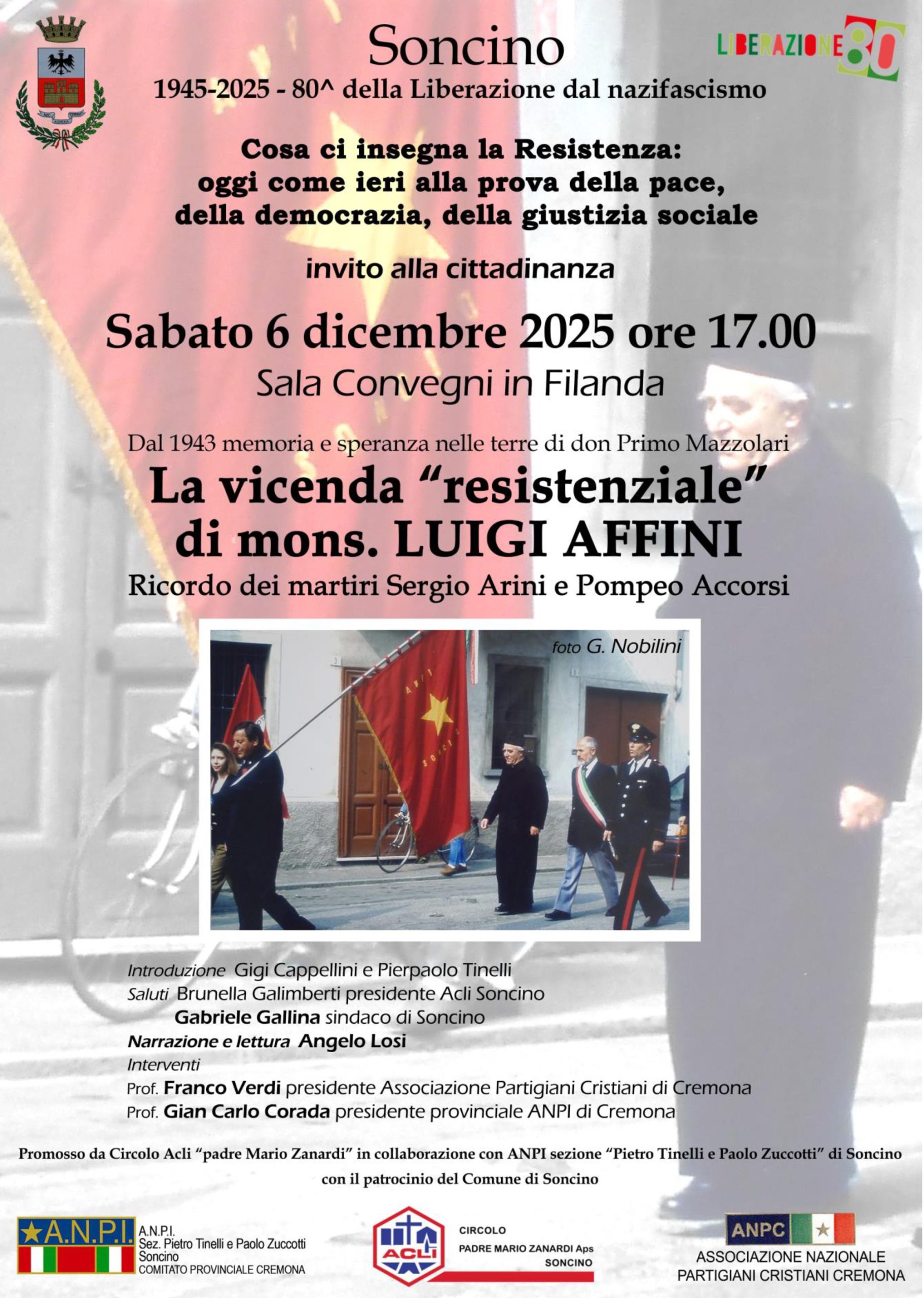 Sabato 6 dicembre a Soncino, nell’ambito dell’80° della Liberazione dal nazifascismo, il locale circolo ACLI “Padre Mario Zanardi” si fa promotore, con la collaborazione della sezione locale ANPI, di un incontro che metterà sotto la lente la figura di mons. Luigi Affini, classe 1922, parroco di Soncino dal 1962 al 1997, che nel luglio 1944, da giovane chierico, fu arrestato e incarcerato dai nazisti.