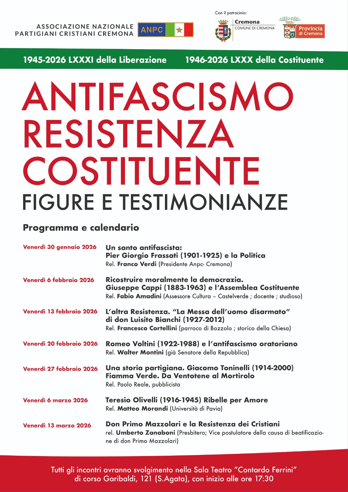 La duplice ricorrenza commemorativa dell’anno – Liberazione e Costituente – introduce ai due nuclei tematici che caratterizzano il programma e il calendario degli incontri di iniziativa culturale dell’Anpc (Associazione nazionale partigiani cristiani) di Cremona per il 2026. La scelta metodologica dell’offerta si declina nella memoria narrativa di figure e testimonianze relative alla partecipazione dei cattolici ai processi storici dell’Antifascismo, della Resistenza e dell’Assemblea Costituente che rappresentano le premesse della scelta repubblicana e la preparazione della Carta Costituzionale.