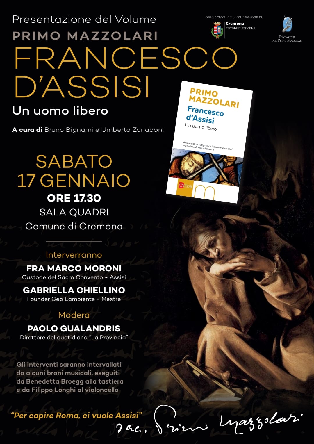 Alla presentazione interverranno fra Marco Moroni, Custode del Sacro Convento di Assisi, e Gabriella Chiellino, Founder Ceo di Eambiente (Mestre), che offriranno la loro testimonianza di legame spirituale con san Francesco. L’incontro sarà moderato da Paolo Gualandris, direttore del quotidiano La Provincia di Cremona e i vari interventi saranno intervallati da brani musicali eseguiti da Benedetta Broegg alla tastiera e da Filippo Longhi al violoncello.