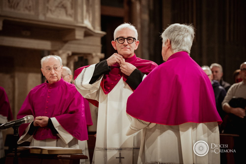 Si è svolto nel pomeriggio di sabato 8 novembre il rito di accoglienza nel Capitolo Canonicale della Cattedrale di Cremona del nuovo canonico effettivo mons. Gianluca Gaiardi che, in quanto rettore della Cattedrale, durante lo svolgimento del proprio incarico per statuto sarà anche membro del Capitolo. Il rito di immissione ha avuto inizio alle 17.30, in forma pubblica, nella navata centrale del Duomo, di fronte al presidente del collegio, mons. Antonio Trabucchi.