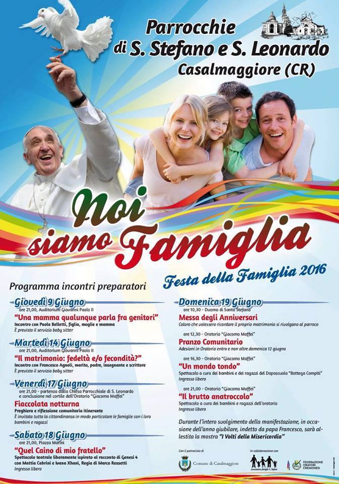 “Noi siamo famiglia”. Questo lo slogan della festa della famiglia in programma a Casalmaggiore domenica 19 giugno con un ricco programma di eventi, anticipati già da giovedì 9 da una serie di incontri preparatori.