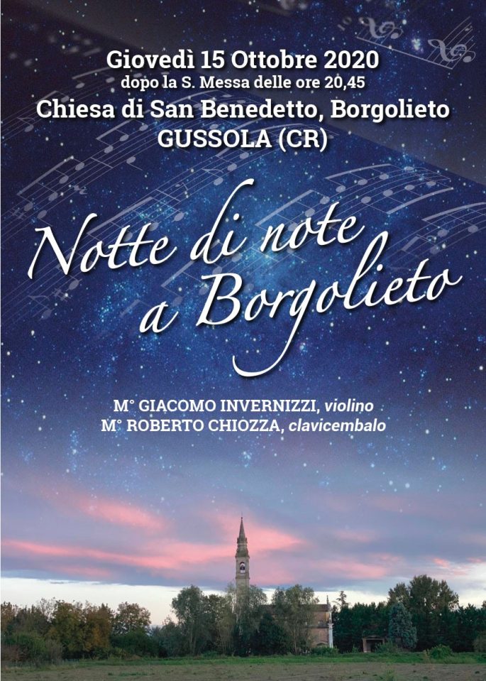 Dopo la riapertura, nel luglio scorso, della chiesetta settecentesca intitolata a San Benedetto, presso la frazione di Borgolieto, a Gussola, si sono susseguite in questi mesi iniziative a carattere religioso che ora lasciano spazio a quelle di natura culturale. Ad inaugurare una stagione di eventi sarà, giovedì 15 ottobre, l’iniziativa “Notte di note a Borgolieto”, concerto per violino e clavicembalo tenuto dai maestri Giacomo Invernizzi e Roberto Chiozza, che eseguiranno il seguente repertorio: