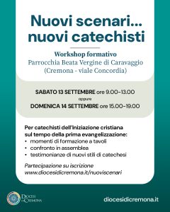 Una occasione formativa rivolta ai catechisti dell’iniziazione cristiana per guardare a “Nuovi scenari… nuovi catechisti”. È questo lo slogan del workshop formativo che si terrà a metà settembre a Cremona. L’evento, promosso dall’Ufficio catechistico della Diocesi di Cremona, si svilupperà in due diverse giornate di lavoro tra cui poter scegliere: la mattina di sabato 13 settembre (dalle 9 alle 13, concludendo con la possibilità di fermarsi per il pranzo insieme) oppure il pomeriggio di domenica 14 settembre (dalle 15 alle 19). Entrambe le giornate si svolgeranno presso la parrocchia della Beata Vergine di Caravaggio (in viale Concordia) e per la partecipazione è necessaria l’iscrizione attraverso il form www.diocesidicremona.it/nuoviscenari.