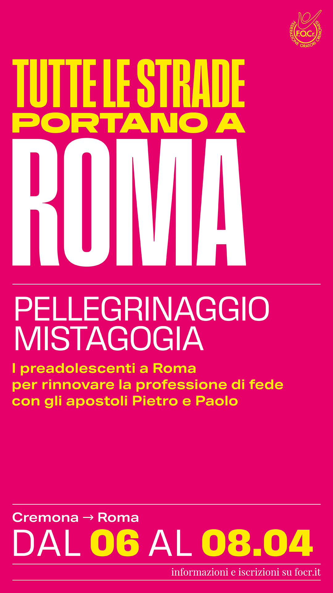 La Federazione Oratori Cremonesi propone anche quest’anno il pellegrinaggio per preadolescenti a Roma nei giorni dopo Pasqua, da lunedì 6 a mercoledì 8 aprile. Dal titolo “Tutte le strade portano a Roma”, sarà occasione per coinvolgere tutti i ragazzi della Mistagogia tra tappe, visite culturali, momenti di spiritualità e naturalmente l’incontro con Papa Leone XIV. Un appuntamento ormai consueto che quest’anno cambia un po’, con la proposta che d’ora un poi avrà cadenza biennale.