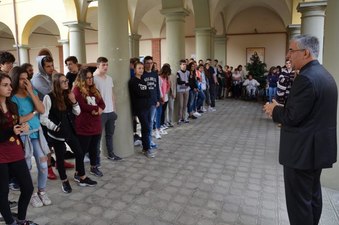 Accompagnato da madre Firmina, la superiora, il Vescovo si è quindi spostato di poche decine di metri, al di là della chiesa, incontrando i ragazzi del liceo delle Scienze umane e del più recente Cfp per Addetto preparatore pasti, rispettivamente circa 50 e 130 studenti.