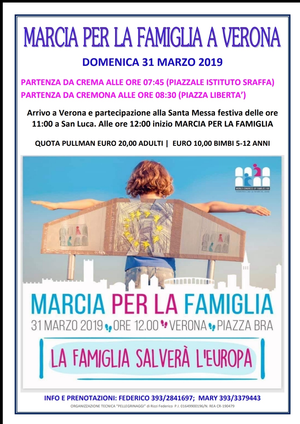 Dal 29 al 31 marzo a Verona si svolgerà il Congresso Mondiale delle Famiglie che si concluderà con la Marcia per la Famiglia di domenica 31. Sarà possibile partecipare grazie al pullman organizzato dalle Sentinelle in piedi che partirà da Cremona e Crema.