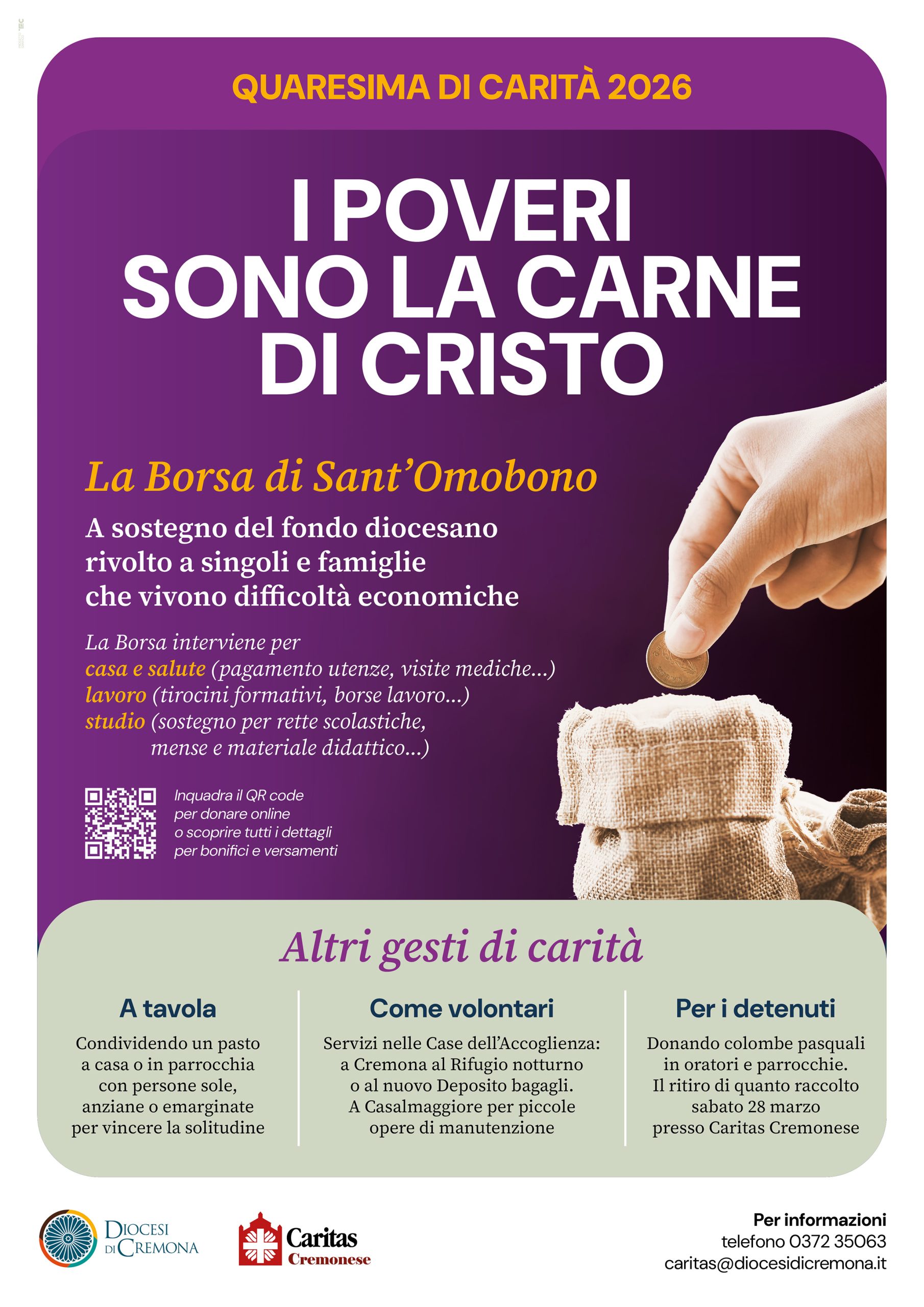 “I poveri sono la carne di Cristo” è lo slogan della Quaresima di Carità 2026 promossa da Caritas Cremonese con una caratterizzazione fatta di preghiera, comunità e carità. Raccogliendo i frutti del Giubileo della Speranza, vengono promosse alcune iniziative, illustrate nella scheda allegata. A disposizione anche alcuni sussidi per la preghiera e la riflessione.