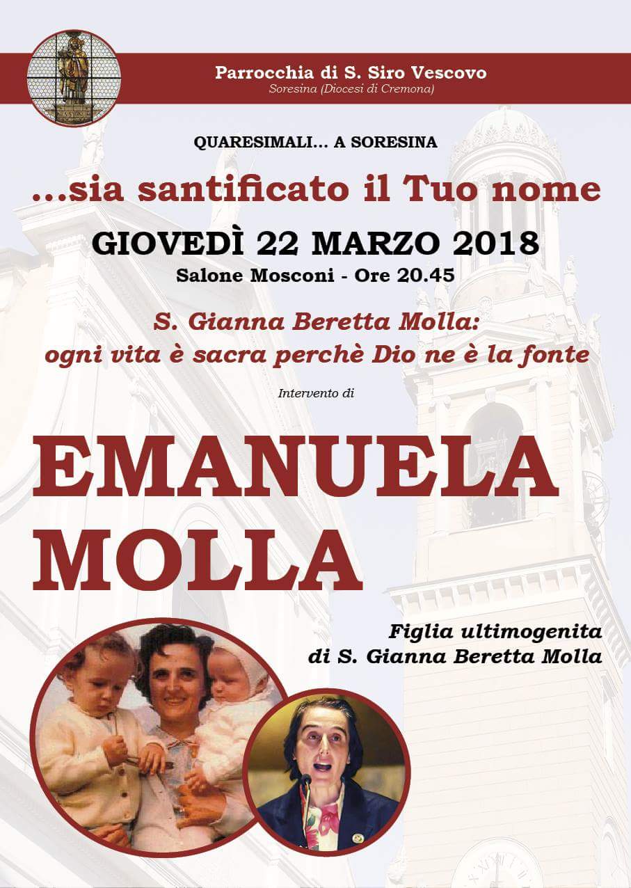 Sarà recuperato la sera di giovedì 22 marzo, alle 20.45 a Soresina, presso il salone Mosconi del centro parrocchiale, l’incontro con Emanuela Molla, figlia ultimogenita per la quale santa Gianna Beretta Molla diede la vita. L’evento, organizzato nel contesto dei Qaresimali promossi dalla parrocchia di S. Siro, era stato inizialmente programmato lo scorso 1° marzo e poi sospeso a causa della neve.