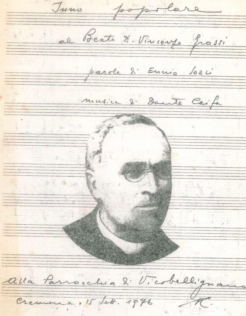Ritrovata una partitura musicale dell’indimenticato sacerdote musicista cremonese don Dante Caifa: un Inno popolare al Beato don Vincenzo Grossi, come lo stesso autore definì la propria composizione. Scritta nel settembre 1976, a poco meno di anno dalla beatificazione di don Vincenzo (1° novembre 1975), è dedicata alla parrocchia di Vicobellignano, di cui il sacerdote pizzighettonese fu parroco dal 1883 al 1917. Il ritrovamento della partitura da parte di don Angelo Ramella, anch’egli originario di Pizzighettone.