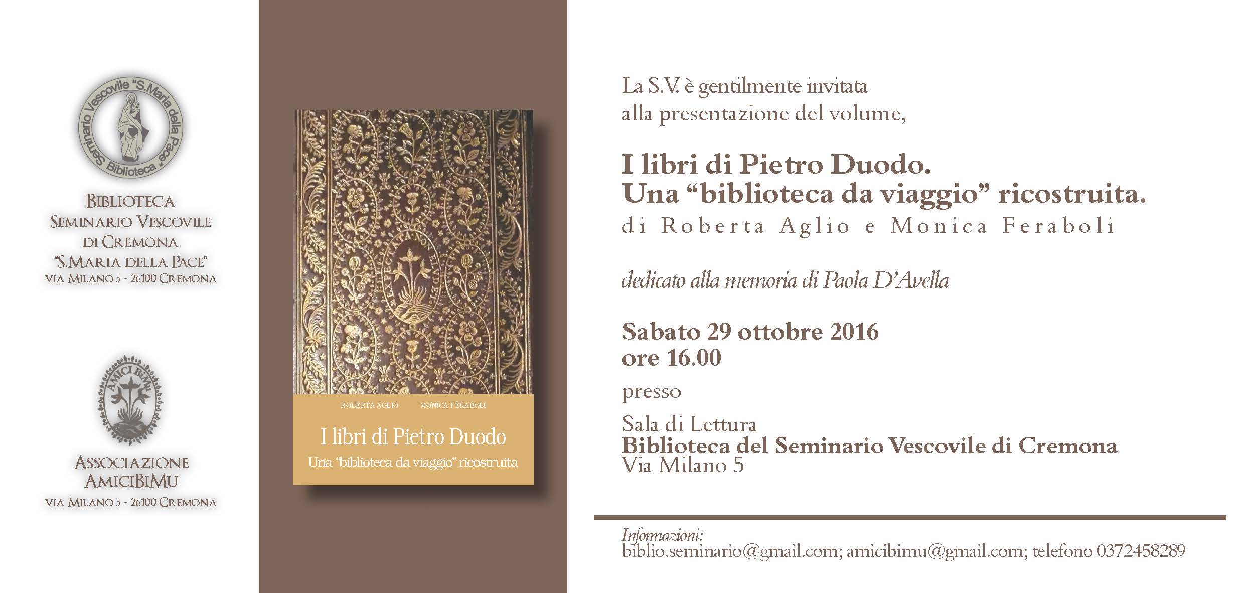 Sabato 29 ottobre, alle ore 16 presso la sala di lettura della Biblioteca del Seminario Vescovile di Cremona, sarà presentato il volume “I libri di Pietro Duodo. Una biblioteca da viaggio ricostruita” a cura di Roberta Aglio e Monica Feraboli, bibliotecarie dell’Istituzione cremonese.