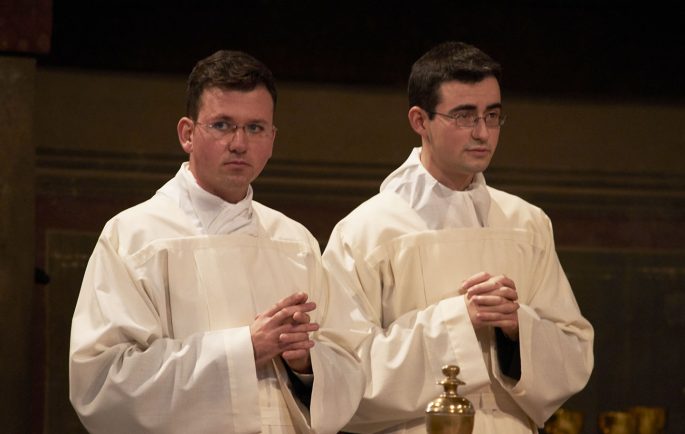 Dopo l’omelia Alberto e Francesco saranno interrogati circa gli impegni propri dell’ordine diaconale. Seguirà il canto delle litanie dei santi, l’imposizione delle mani del Vescovo e la preghiera di ordinazione. La liturgia proseguirà poi con i riti esplicativi: la vestizione dell’abito proprio (stola e dalmatica), la consegna del libro dei Vangeli e l’abbraccio di pace con il Vescovo. La Messa quindi continuerà con la professione di fede e la liturgia eucaristica con i nuovi diaconi che serviranno all’altare.